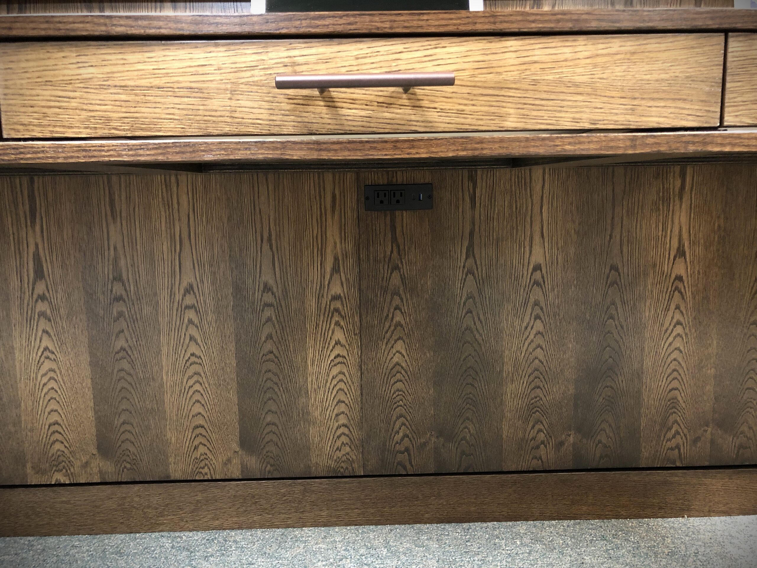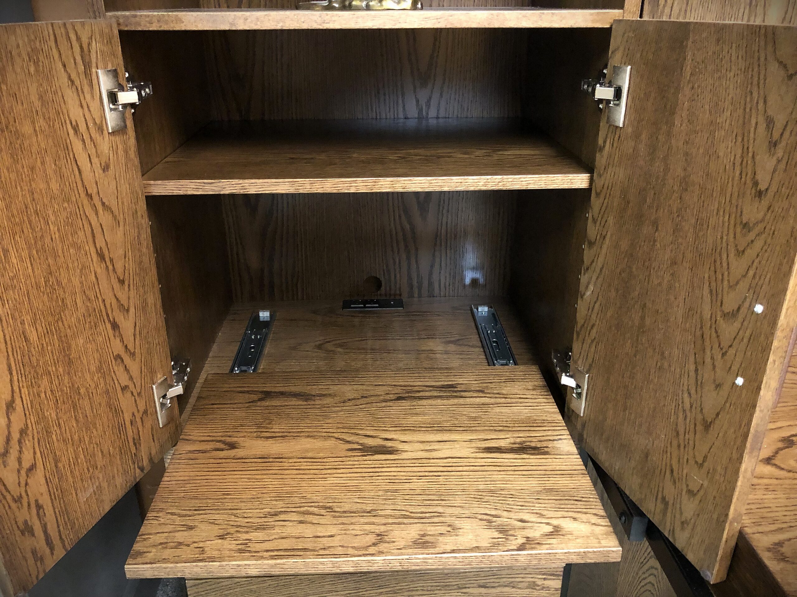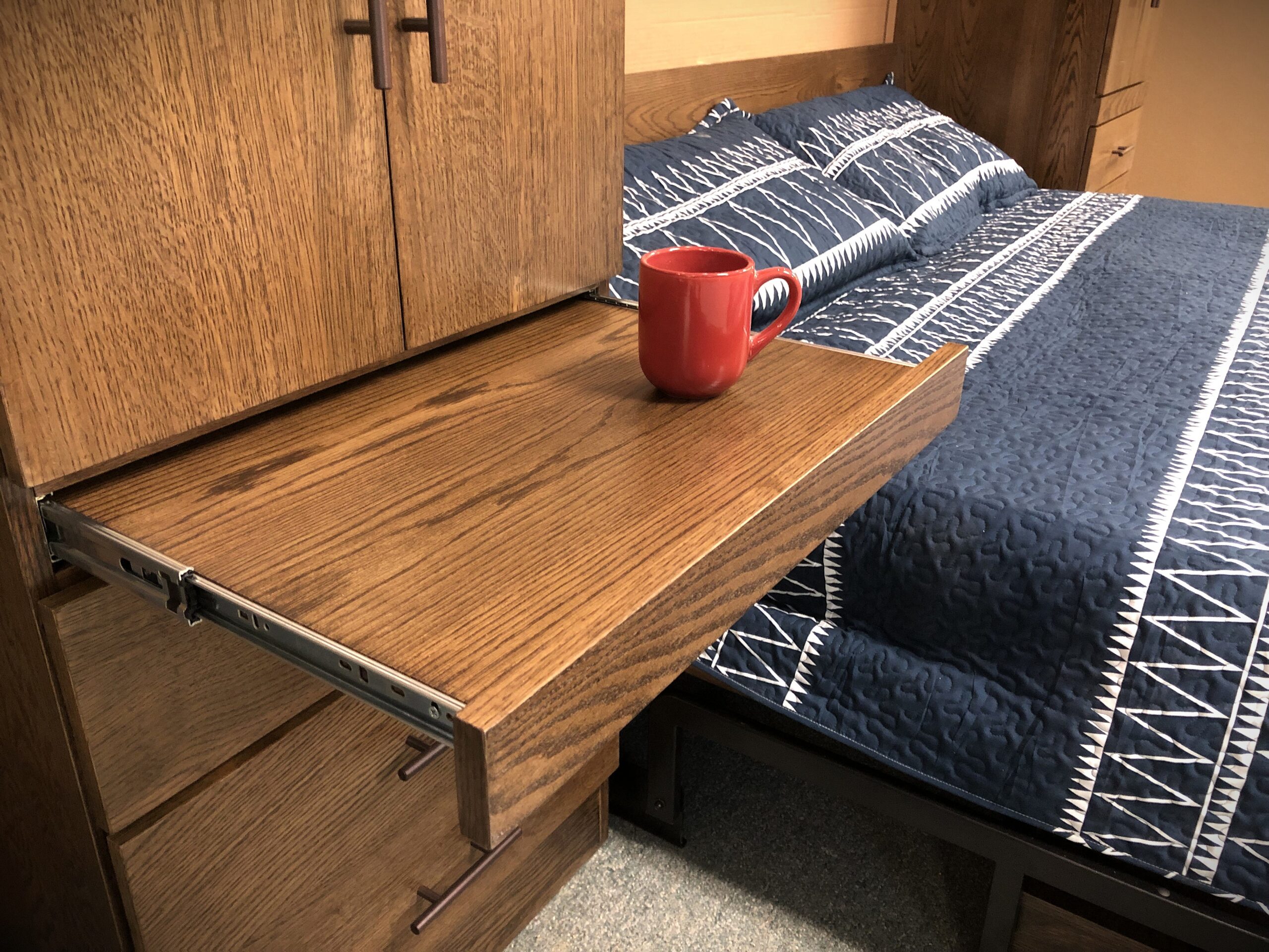 Flanking the bed are 24″ wide side cabinets designed for maximum organization. Each cabinet includes a mid-door section with a pull-out printer tray on both sides, making this layout especially well-suited for a home office or multi-use room.