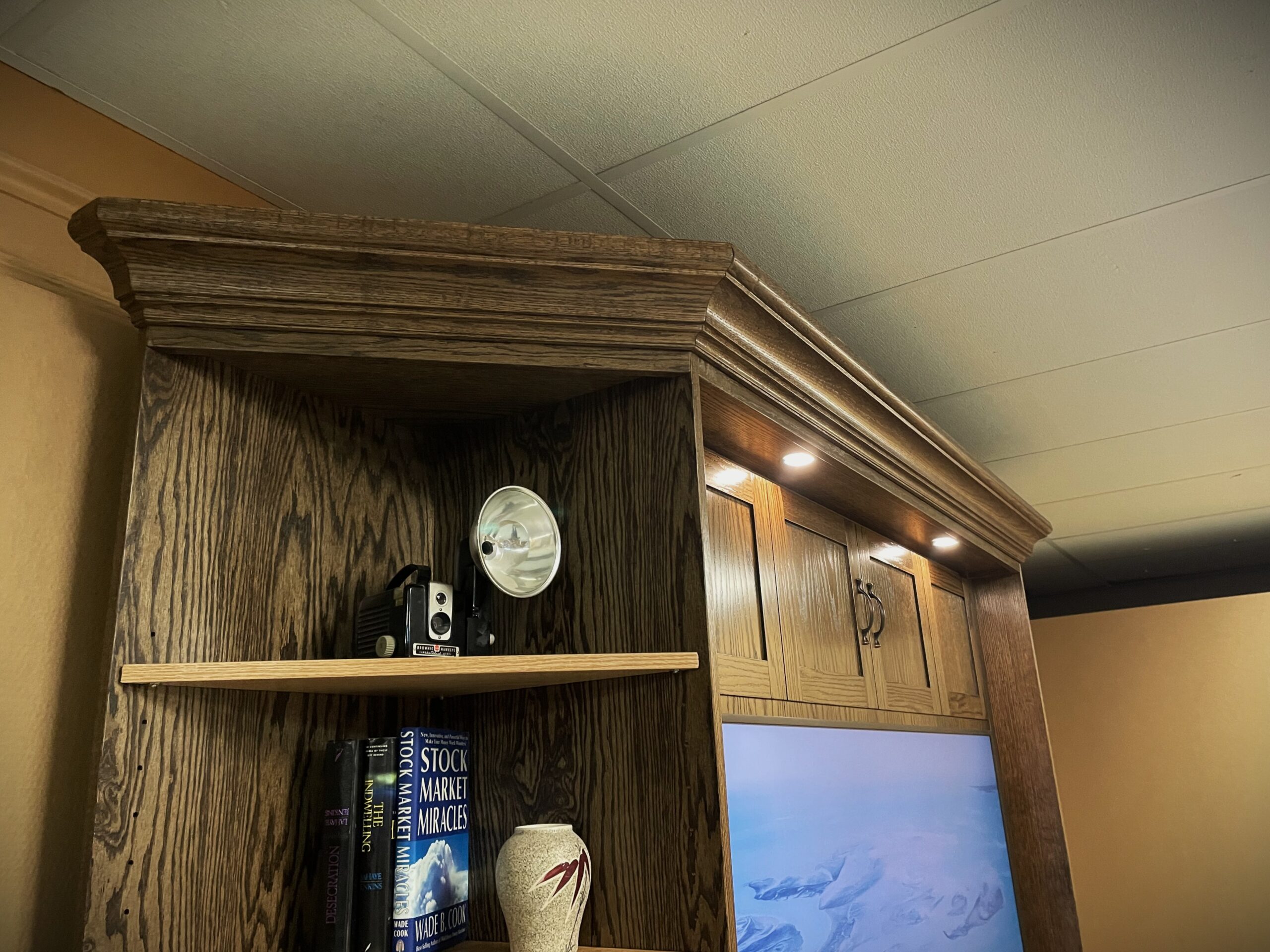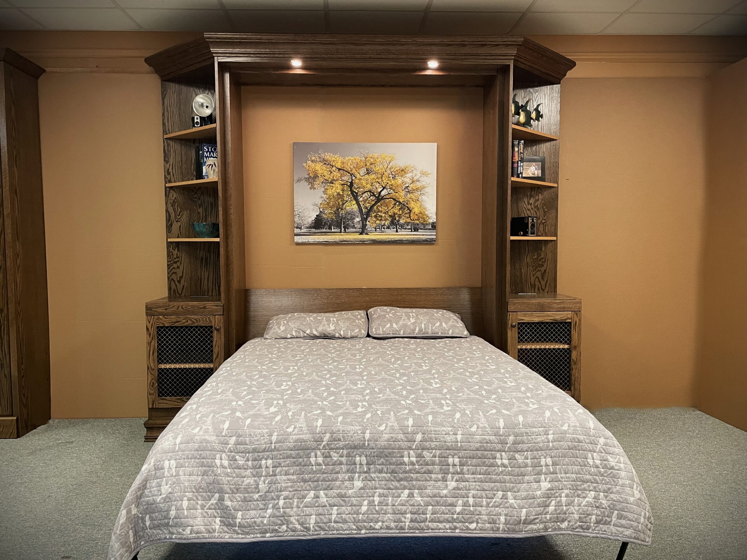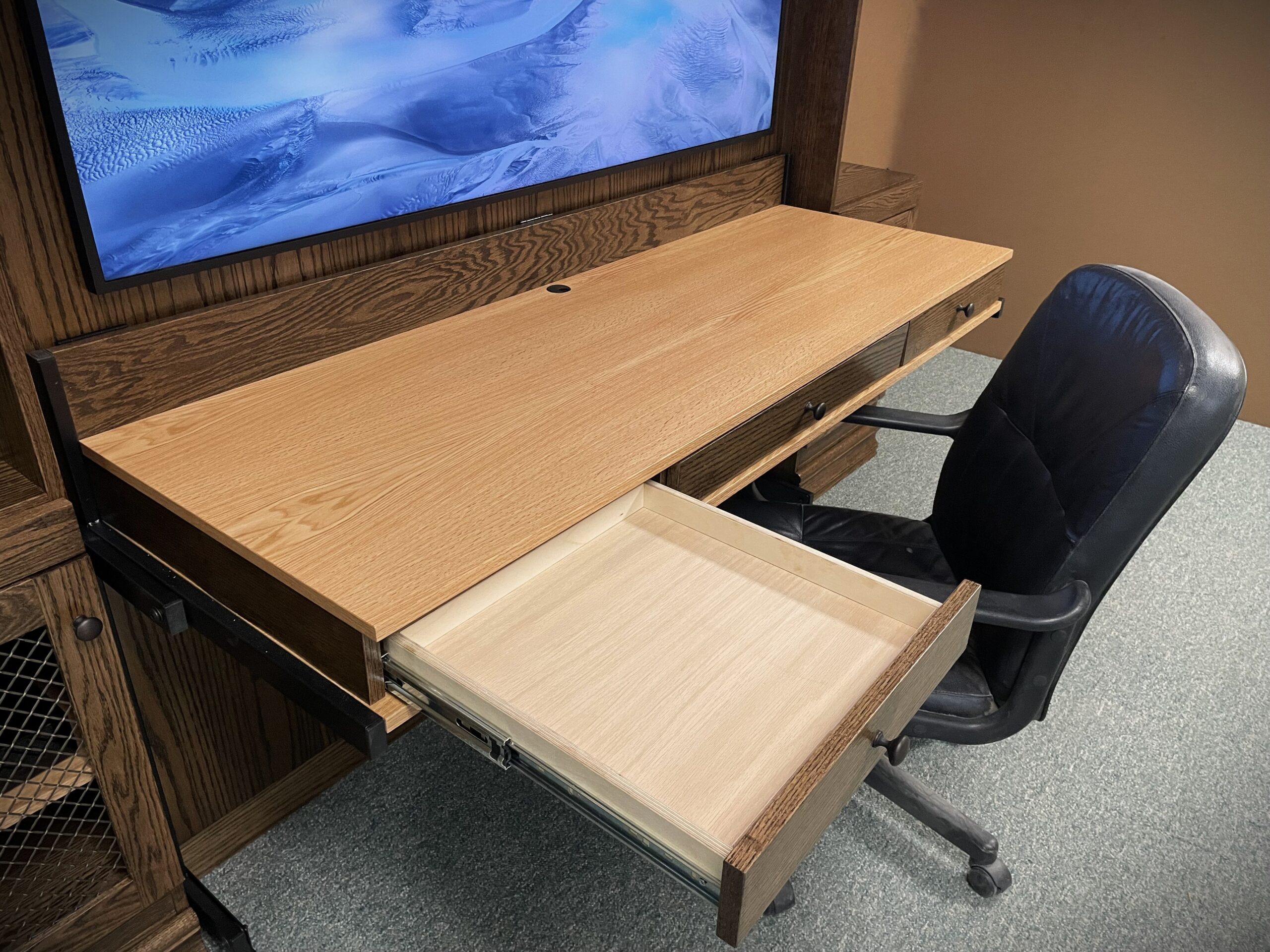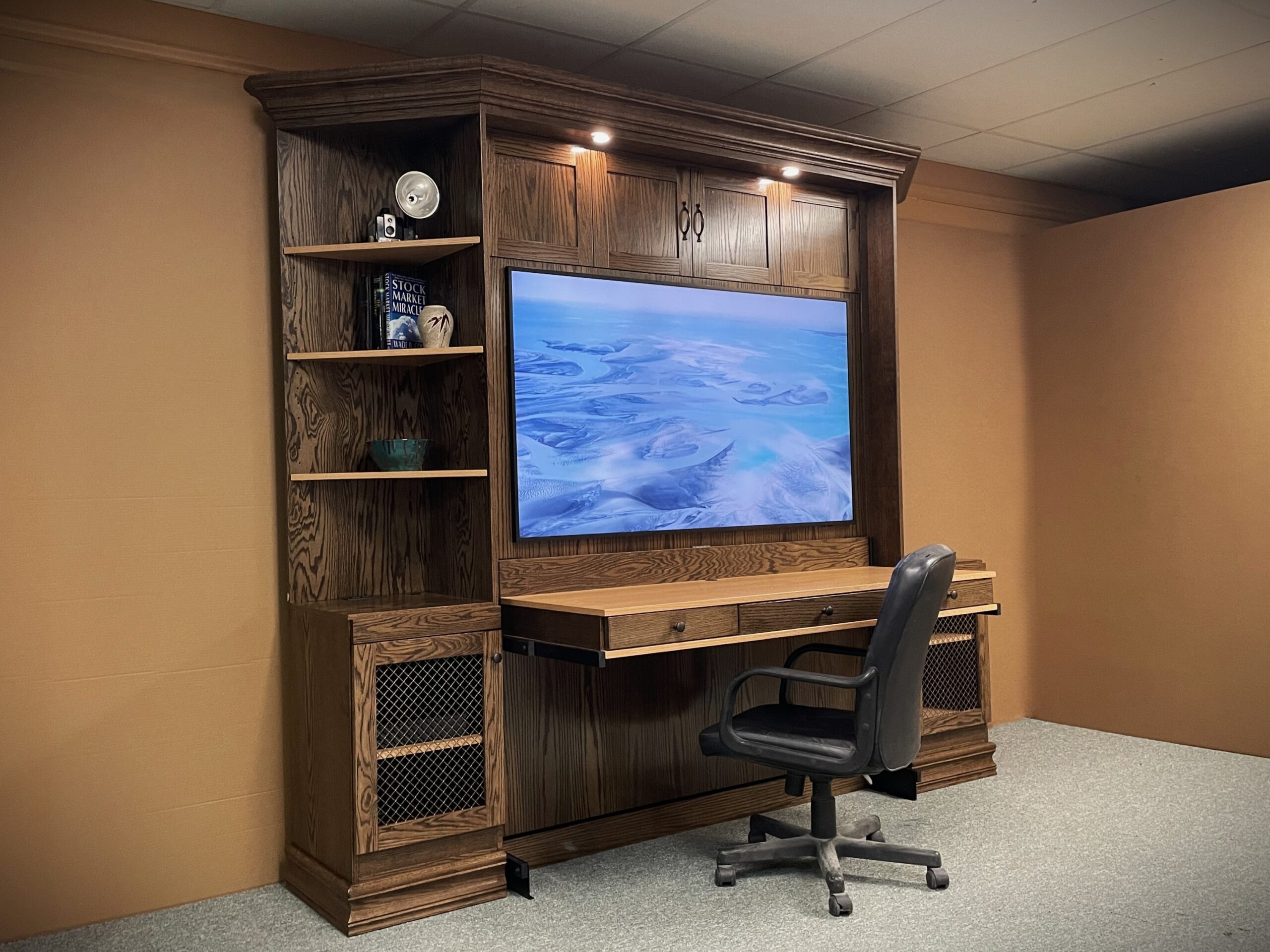This Murphy bed was designed to combine a full entertainment center, a functional workspace, and a comfortable sleeping area into one clean, built-in solution. The two-tone finish adds contrast and character, giving the unit a custom, high-end appearance that stands out in any room.
