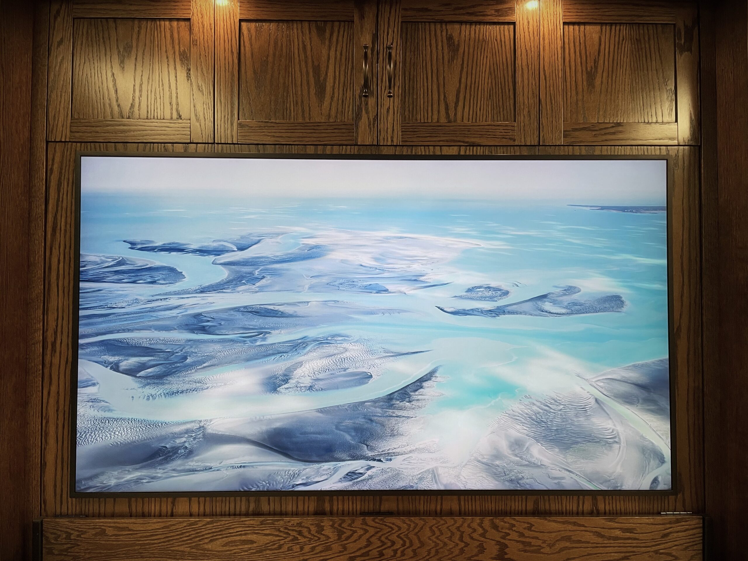 The bed features the TV Desk Face design with a large 65″ Samsung Frame TV as the focal point. The TV is powered through Samsung’s One Connect box, keeping components organized and minimizing visible wiring. Outset lights are built into the bed and controlled by two touch switches, providing both convenience and a finished, architectural look.