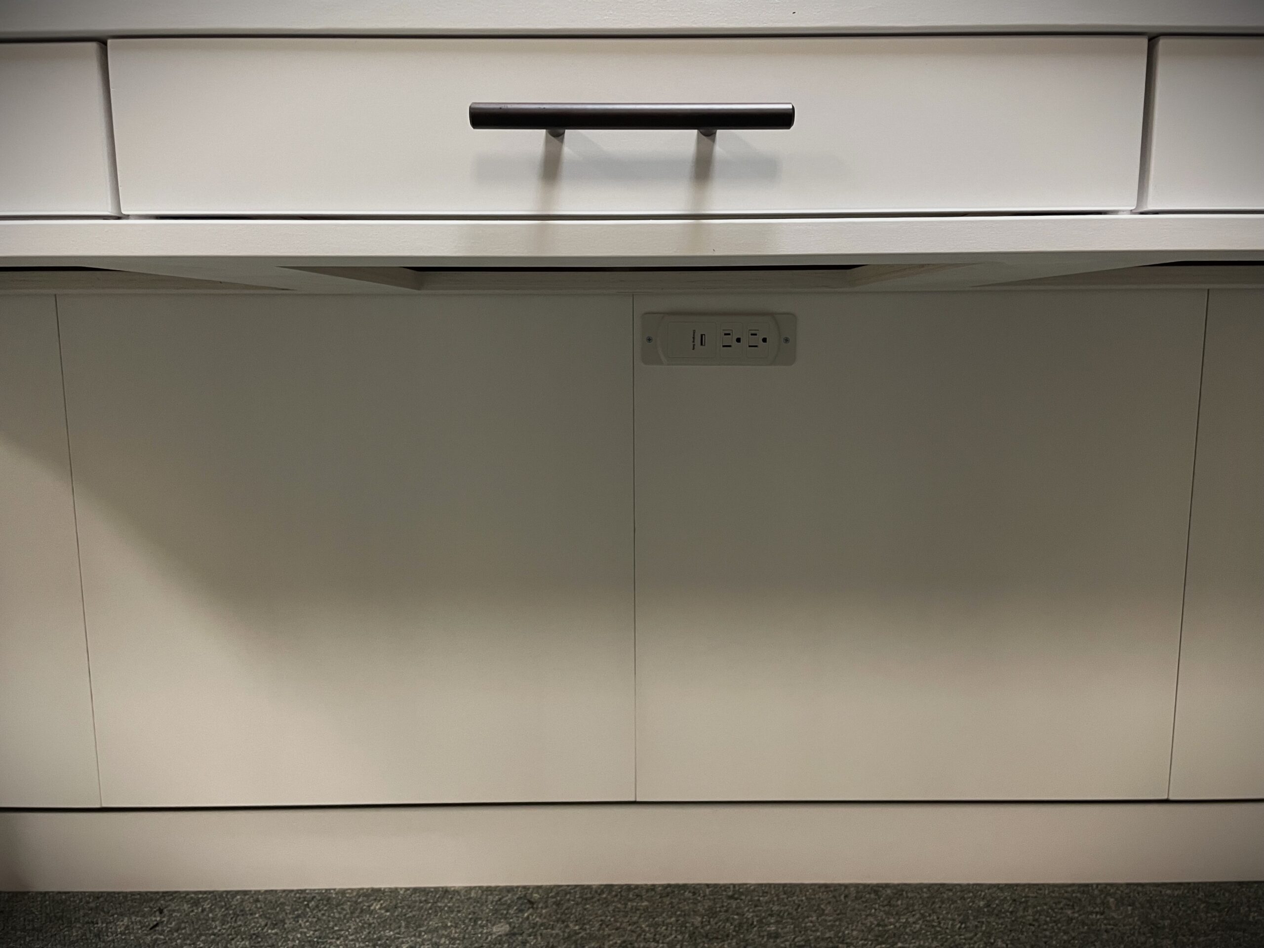 The side bookcase cabinets are 21″ wide. They are called our hybrid bookcases, where the top is cornered. Each side has curved adjustable wood shelves on top. The left side has two standard drawers on the bottom, while the right side has a door with printer pullout.