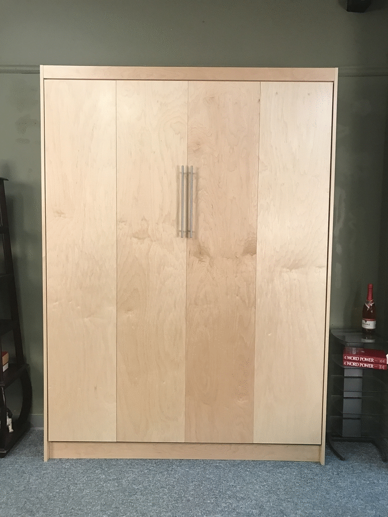 This is our simplest version or our Murphy wall bed. This contemporary piece is designed to resemble a bi-fold closet.   This is accomplished by cutting grooves into the face panel.  This makes it look like a perfect 1/8″ gap between the doors. We can custom build this with any wood and finish.