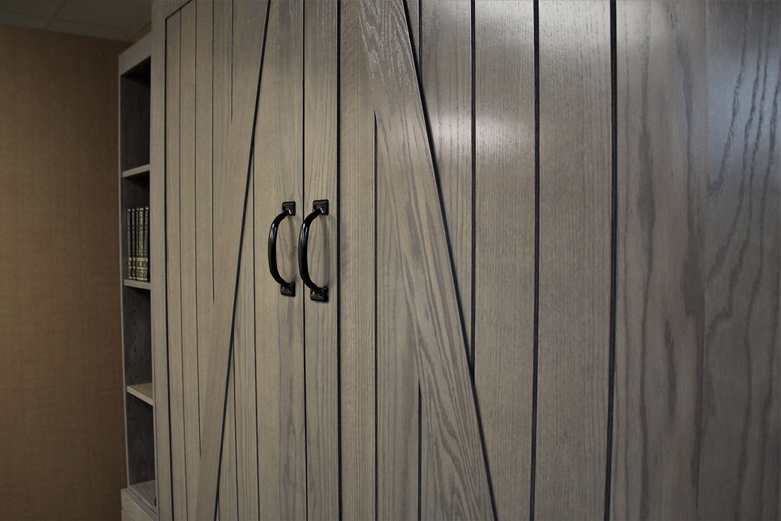 This is a Murphy bed that is designed to look like a pair of barn doors.  The face is a total of 1 inch thick. To keep with that rustic look we use gate pulls for the handles.
