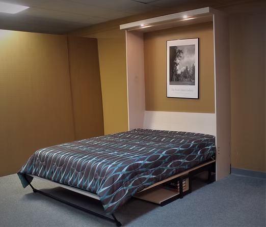 This is a murphy bed that is designed to look like a pair of barn doors. The face is a total of 1″ thick. The customer supplied theses specific pulls but similar ones will be used on any future version.