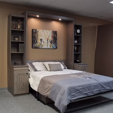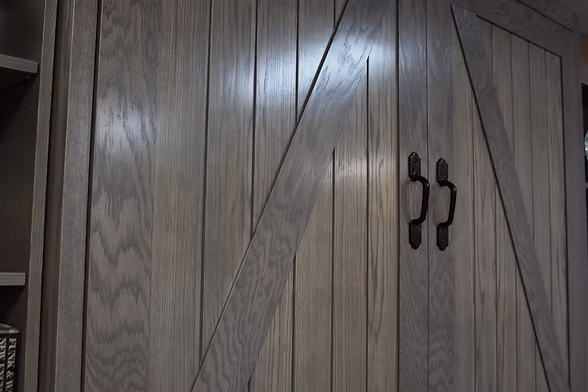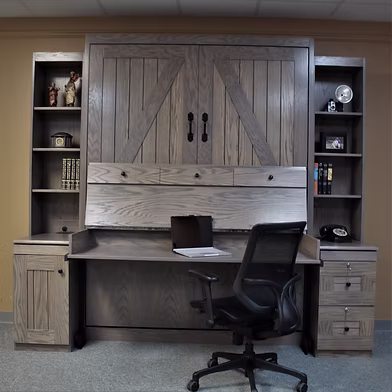 This is a murphy bed that is designed to look like a pair of barn doors. The face is a total of 1″ thick. The customer supplied theses specific pulls but similar ones will be used on any future version.