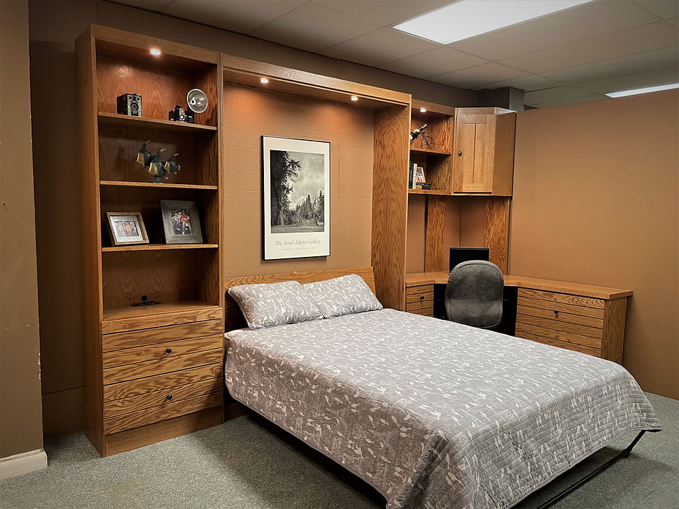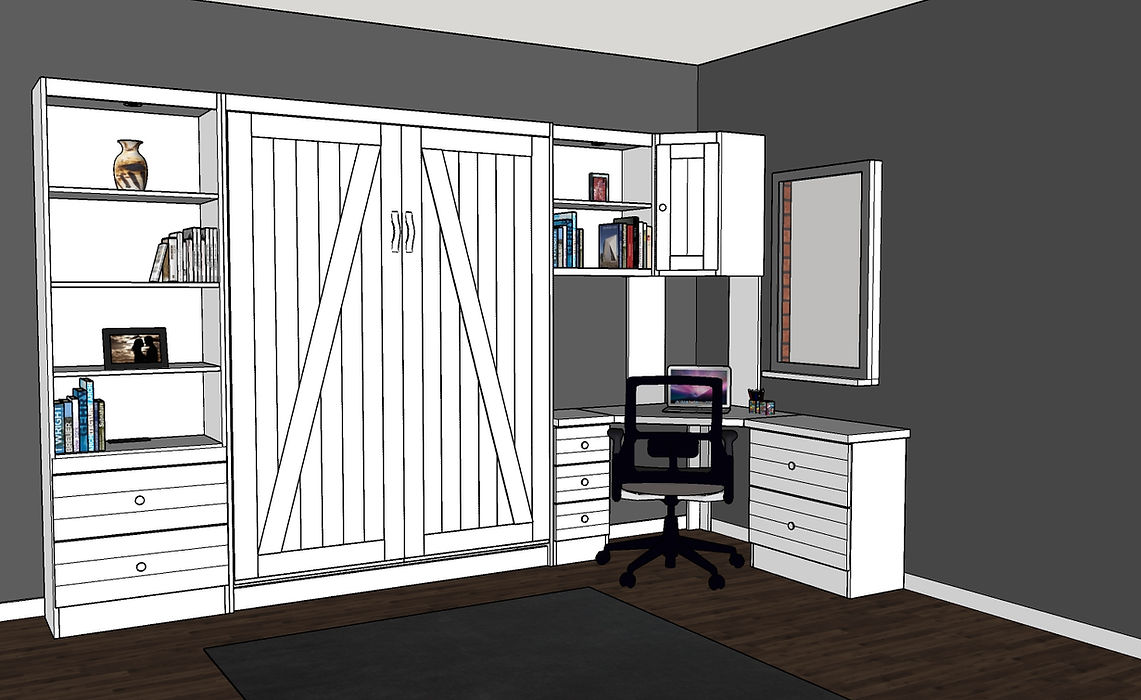 This is a Murphy bed that is designed to look like a pair of barn doors. The face is a total of 1 inch thick. To keep with that rustic look we use gate pulls for the handles.