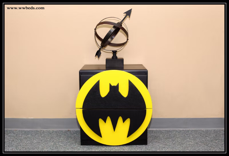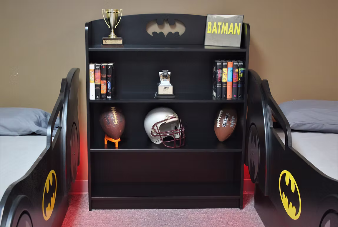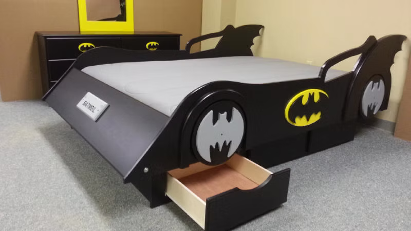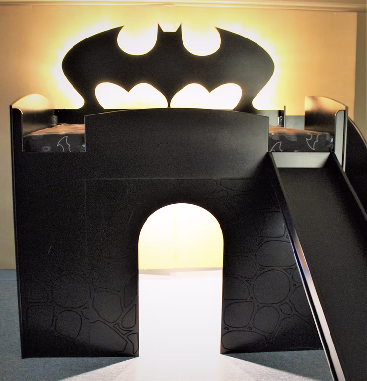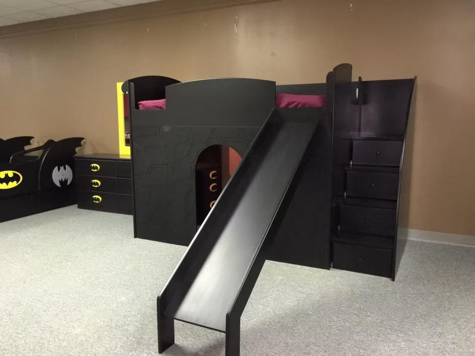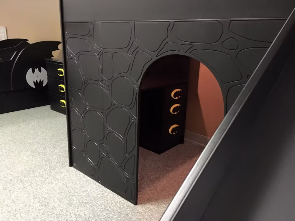 This is a loft bed designed to look like a Bat Cave. It is shown with a desk, slide and stairs, but any custom features can be added or eliminated. You can also customize the configuration.