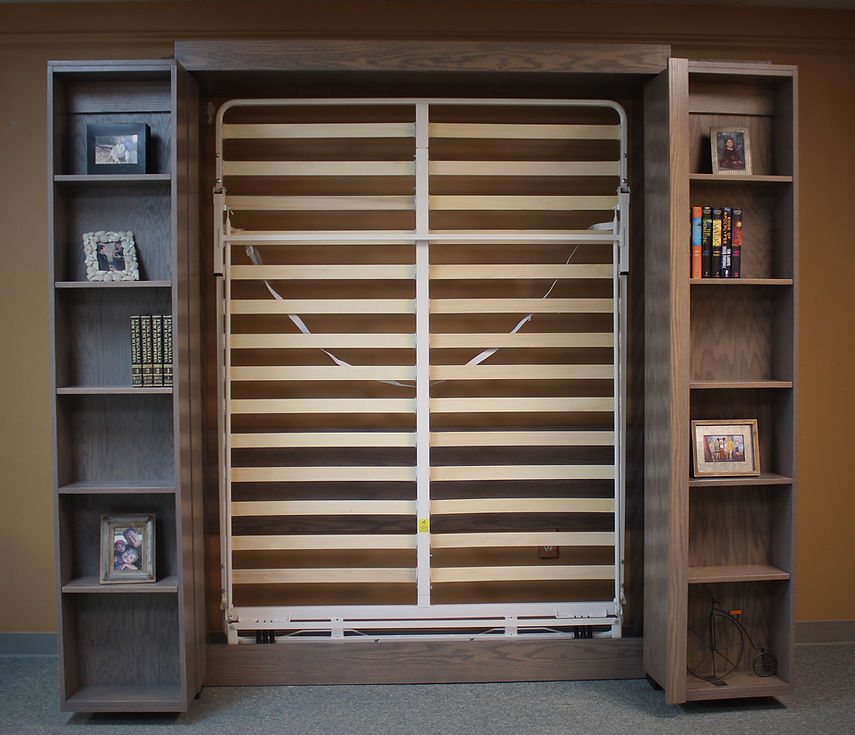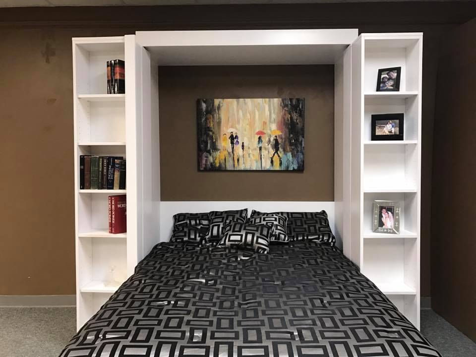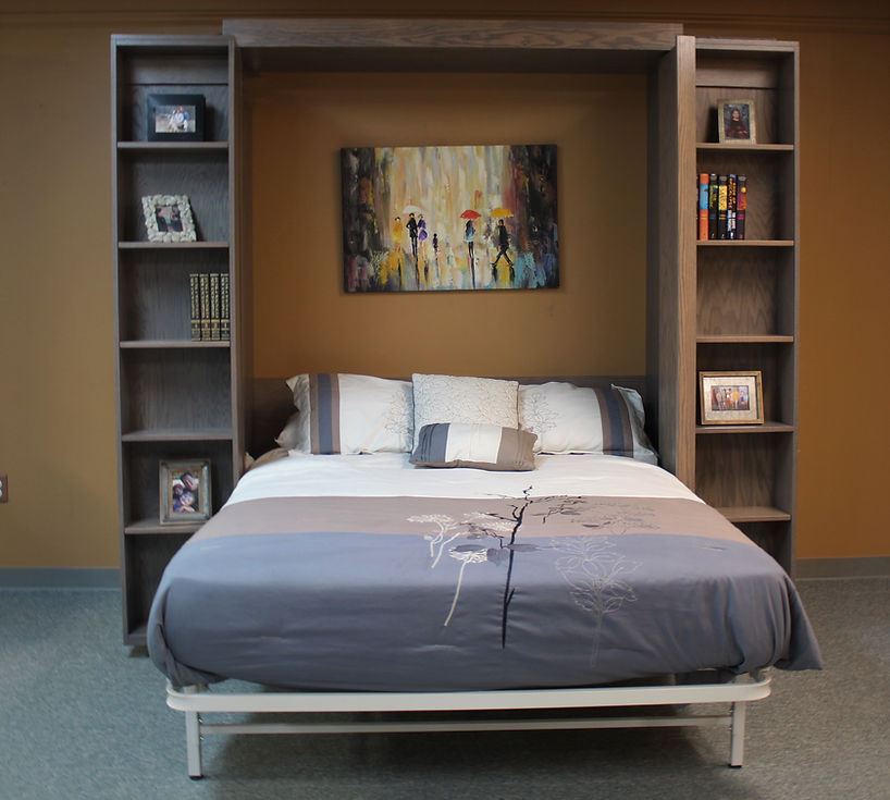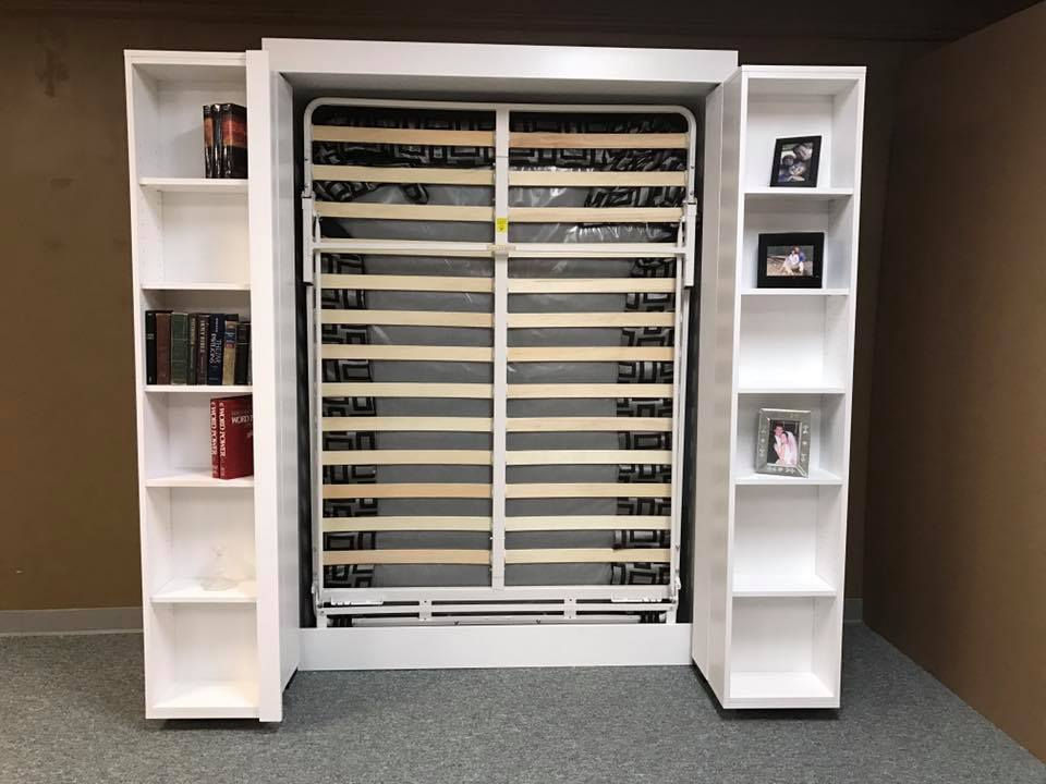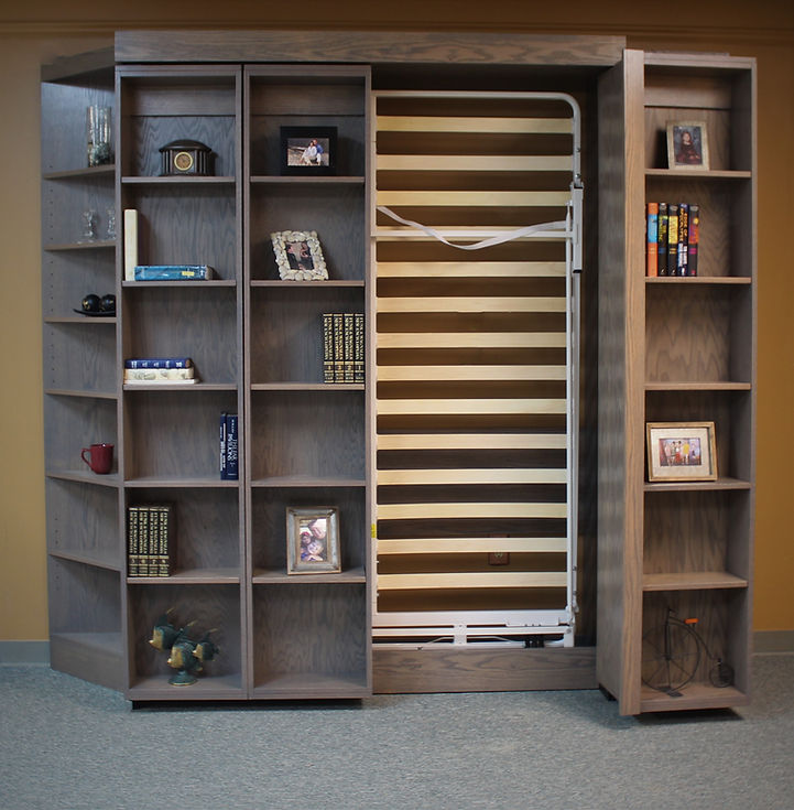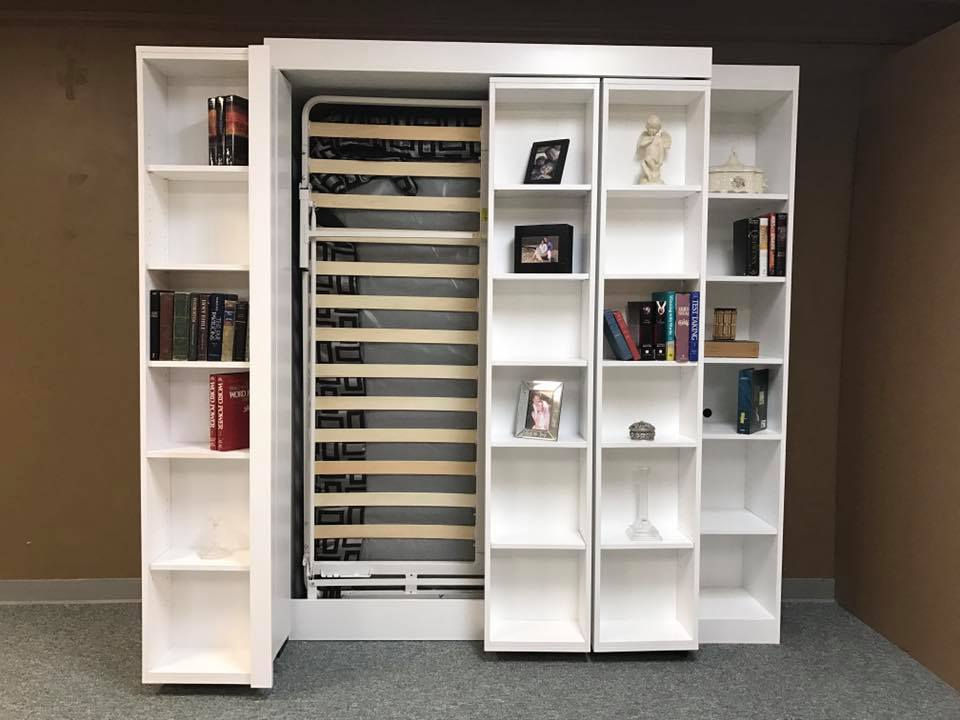 Most of our Murphy beds are what they call Panel Beds with a front face that comes down with the bed. However, this isn’t suitable for a bookshelf design because things could fall off. But in this bookshelf version, we’ve come up with a solution.