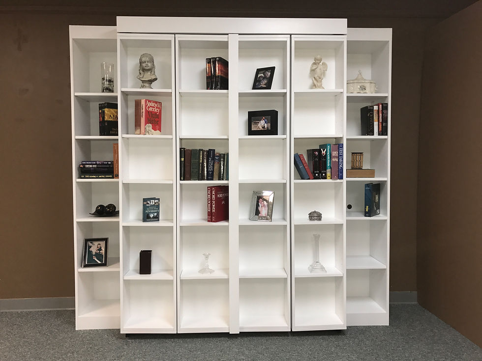 This is a bookshelf system we’ve created. It consists of six bookshelves with about 36 shelves in total. What’s special about this one is that we’ve added a Murphy bed behind the four middle bookshelves.