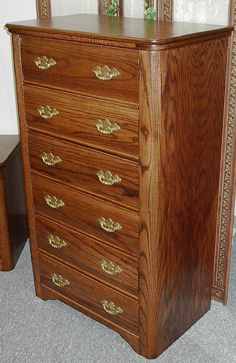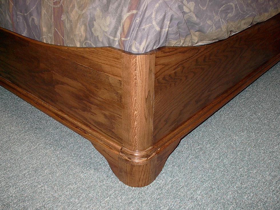This platform bed was copied off an old newpaper ad from a discontinued bed. It features nice curved dips in the footboard and side rails along with rounded corners on the footboard and on the chest, nightstand and dresser.