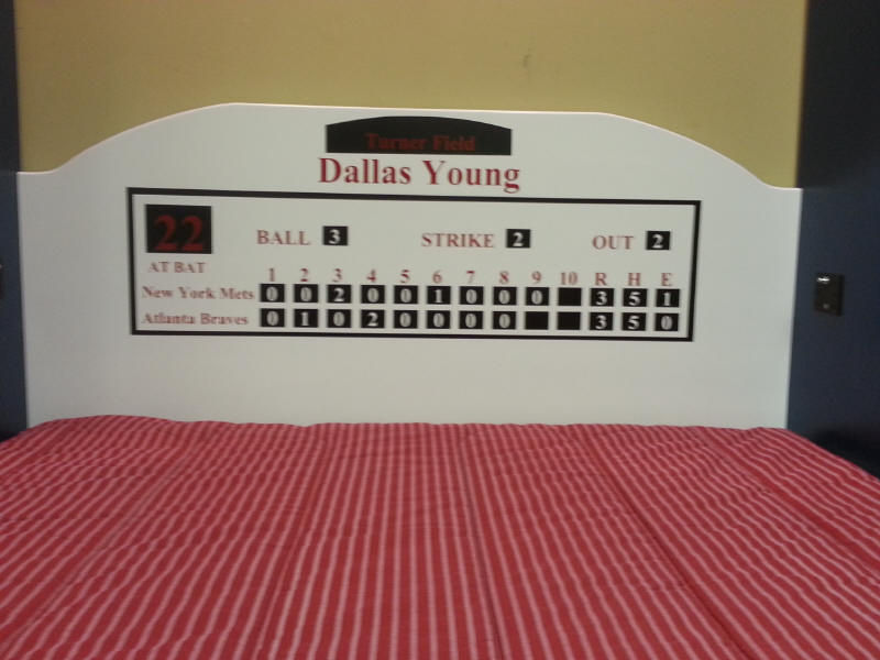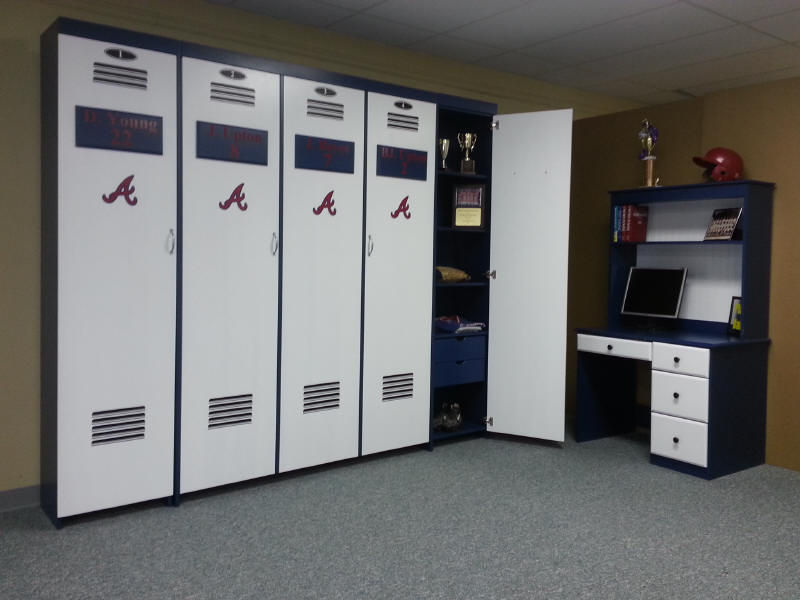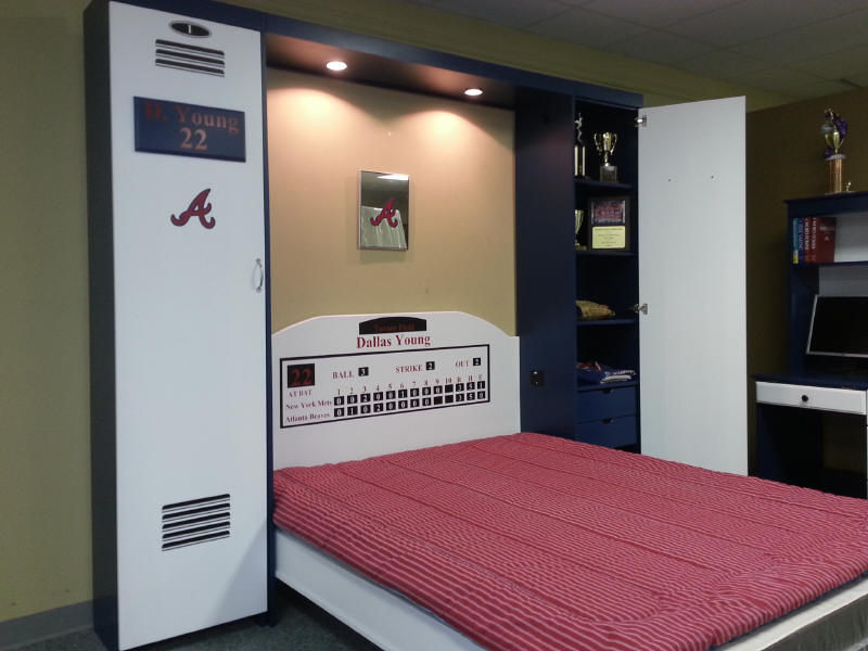 The is a murphy wall bed desinged with a locker theme. This one has the Atlanta Braves theme but any team is avaliable. The three center doors are false and come down with the bed. The outer bookcases are actual working bookcases.