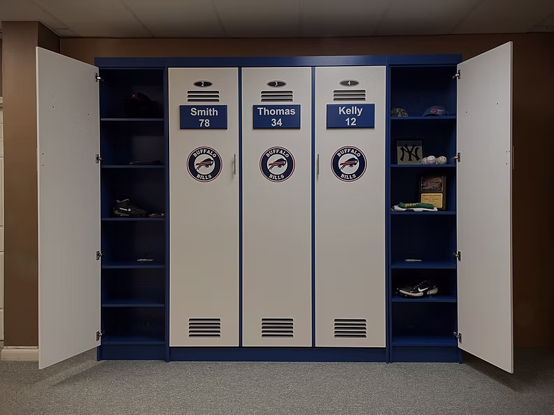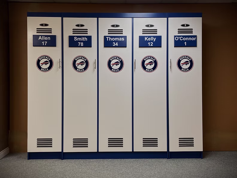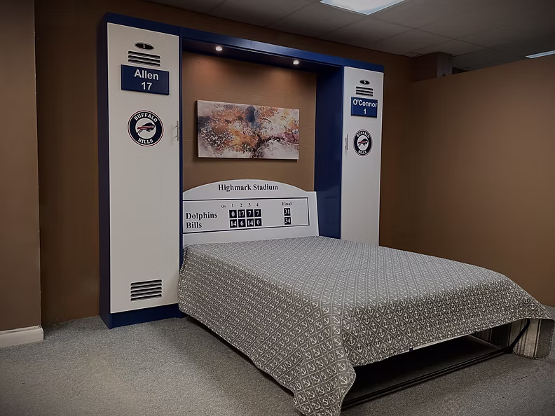 This specific style has five different “lockers”. It also has a scoreboard headboard showcasing when the Bills beat the Dolphins in the January 2024 Wild Card Round.