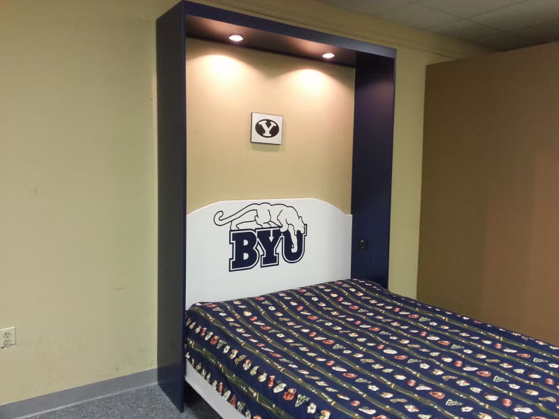 The is a murphy wall bed designed with a locker theme.  This one has the Brigham Young University (BYU) theme but any team is available.  The three center doors are false and come down with the bed.  The outer bookcases are actual working bookcases.