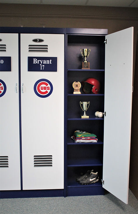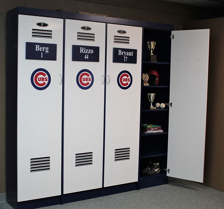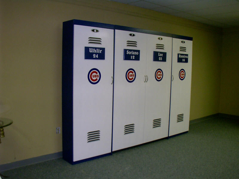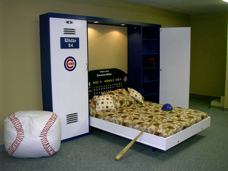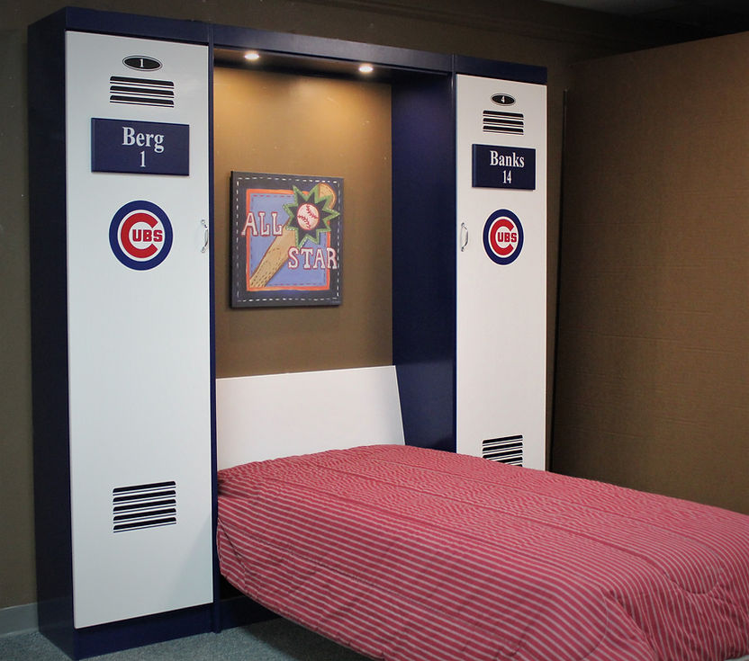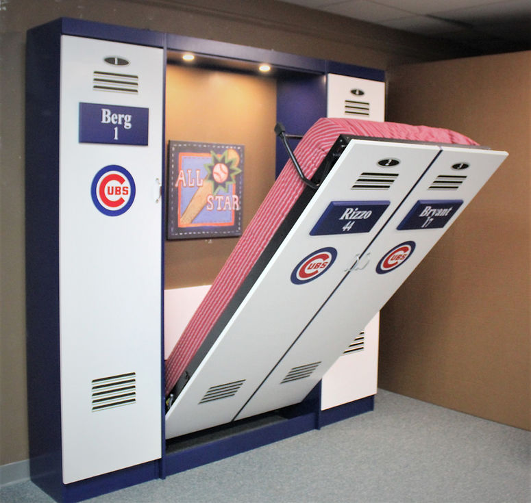 The is a murphy wall bed desinged with a locker theme. This one has the Chicago Cubs theme but any team is avaliable. The two center doors are false and come down with the bed. The outer bookcases are actual working bookcases.