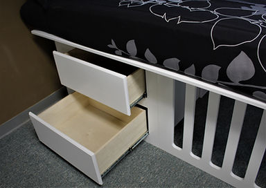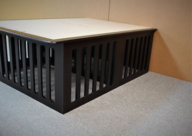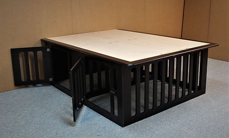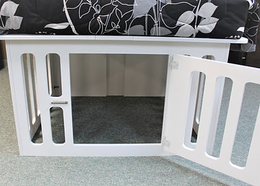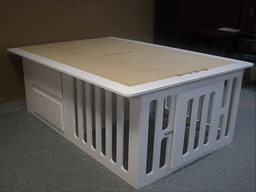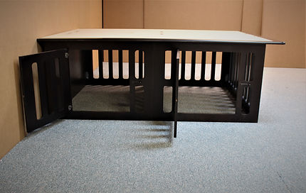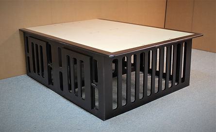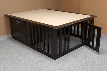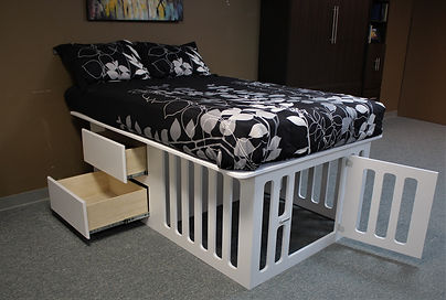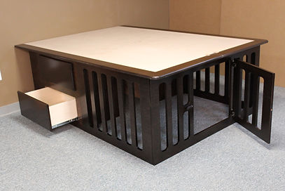 This is a bed designed with a dog kennel built under the bed. The head of the bed has 4 deep drawers for storage and the foot end has a built-in kennel. The Kennel has 3″ spaces between the frame to provide plenty of openness so the dog will not feel closed in. There is also a space between the drawers for added space. That space can be closed off by switching the front and rear dividers during installation.