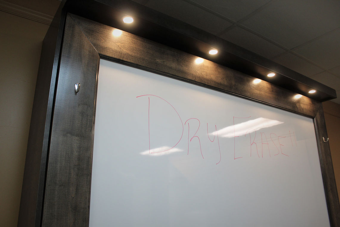 This Murphy Bed is designed to be used as a dry-erase board. We framed the whiteboard section. This bed also has a stay-level desk with it. This is the perfect addition to a home office.