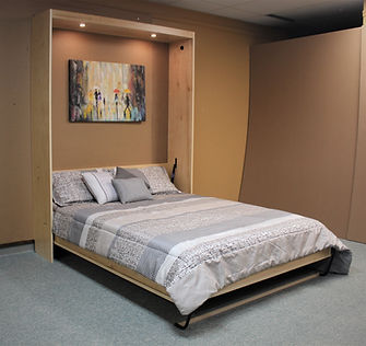 This unique Murphy bed is designed to double as a stunning entertainment center, seamlessly blending functionality and style. Crafted from premium maple wood with a clear coat finish, it features a distinctive face design. You’ll notice the face has a little bit different design.  The doors above and below the doors are half the size and doubled up. We did this to make the larger panels on the side be real close to the size of the smaller door panels.