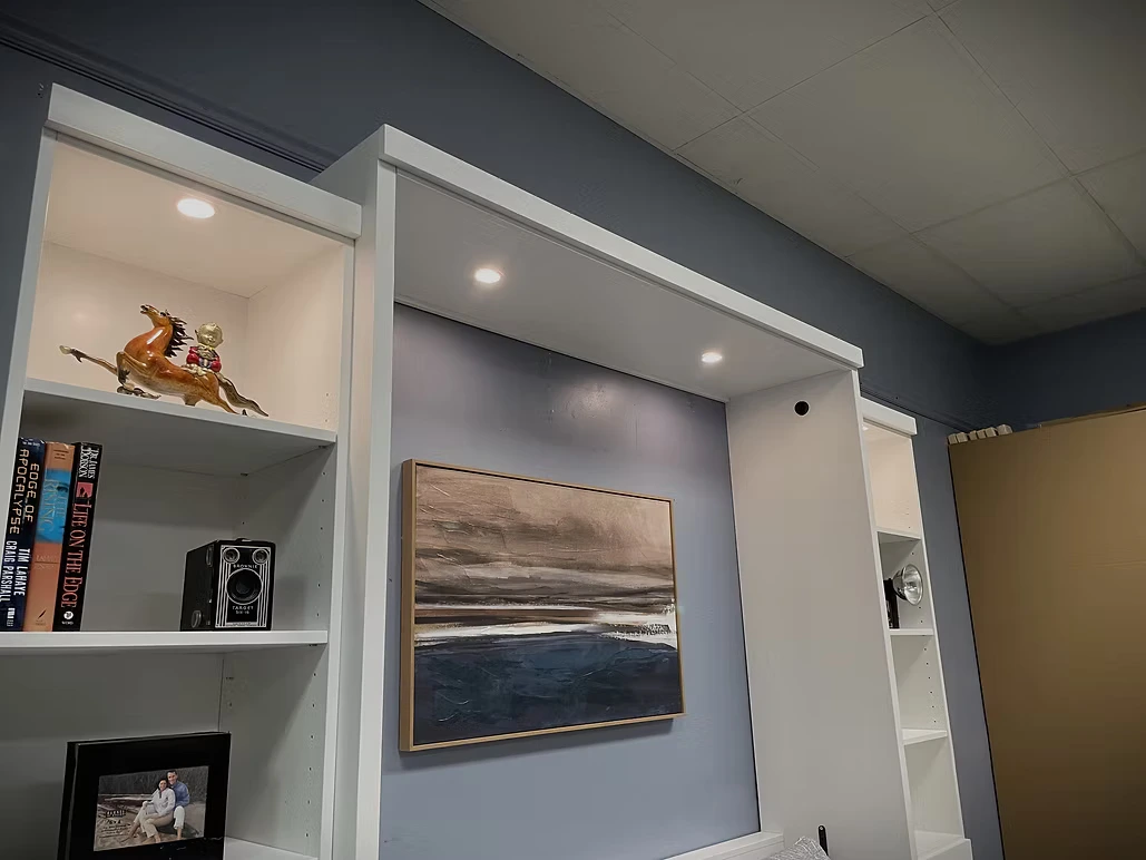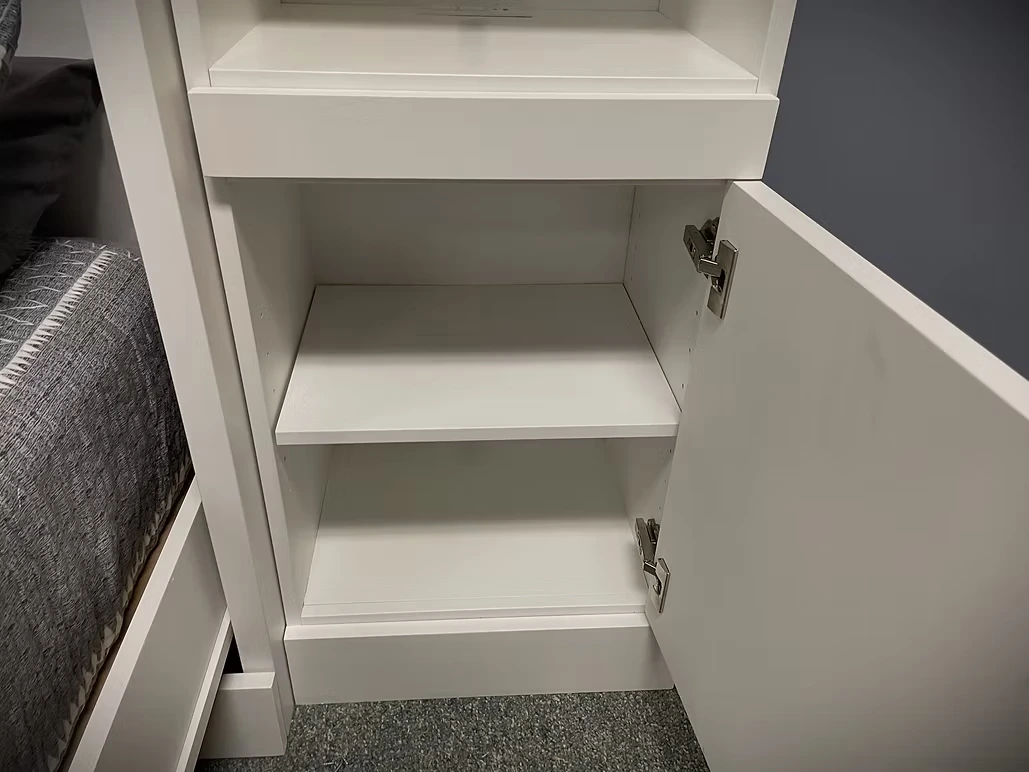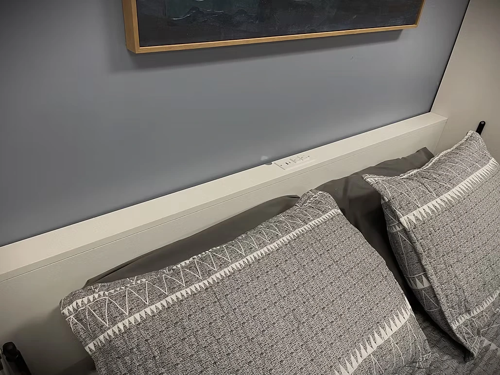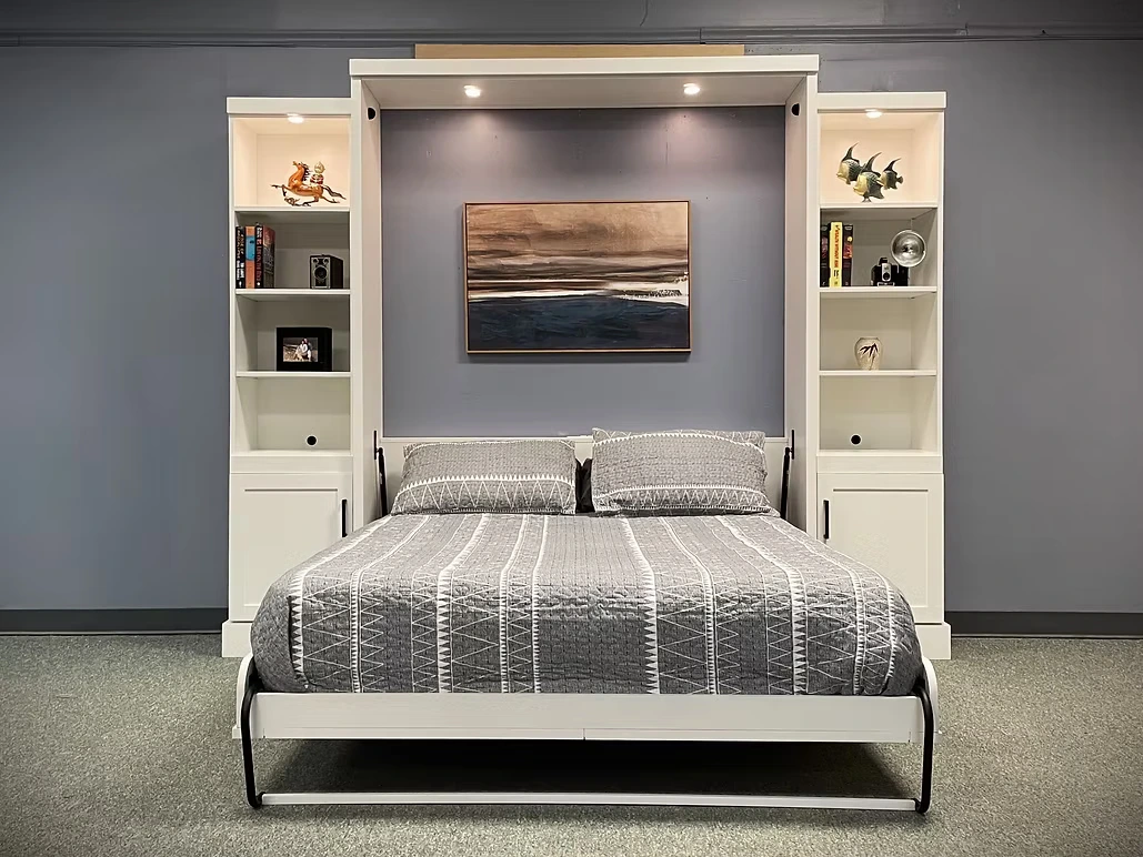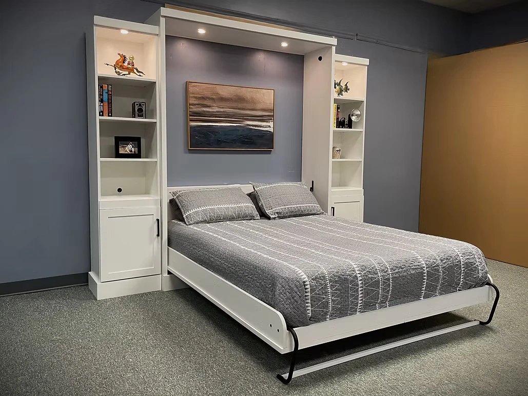 This one features a larger 65″ Samsung The Frame” LS003 Series are the most popular. This Television is made to fit tight against the wall and works well with this Murphy bed.  The power cord is low profile and the accessories hook-up such as HDMI or Cable will be controlled by a box that can be placed anywhere. That box is connected by a very thin wire.