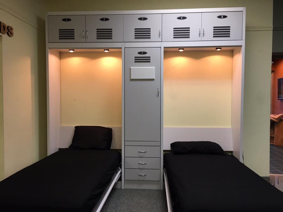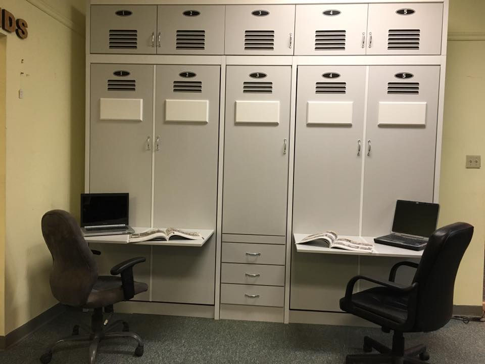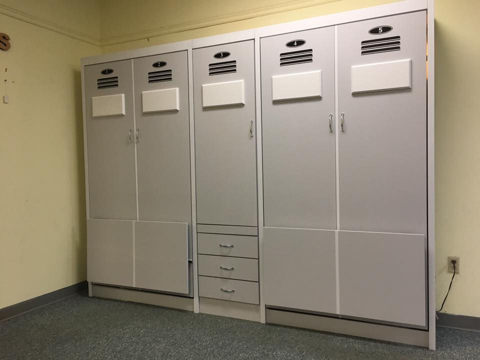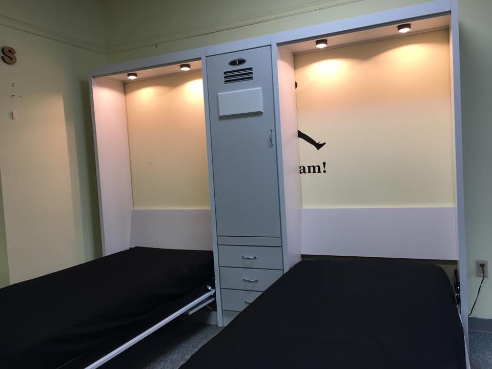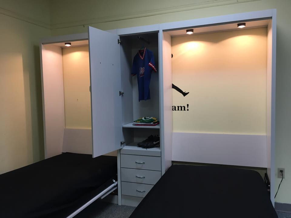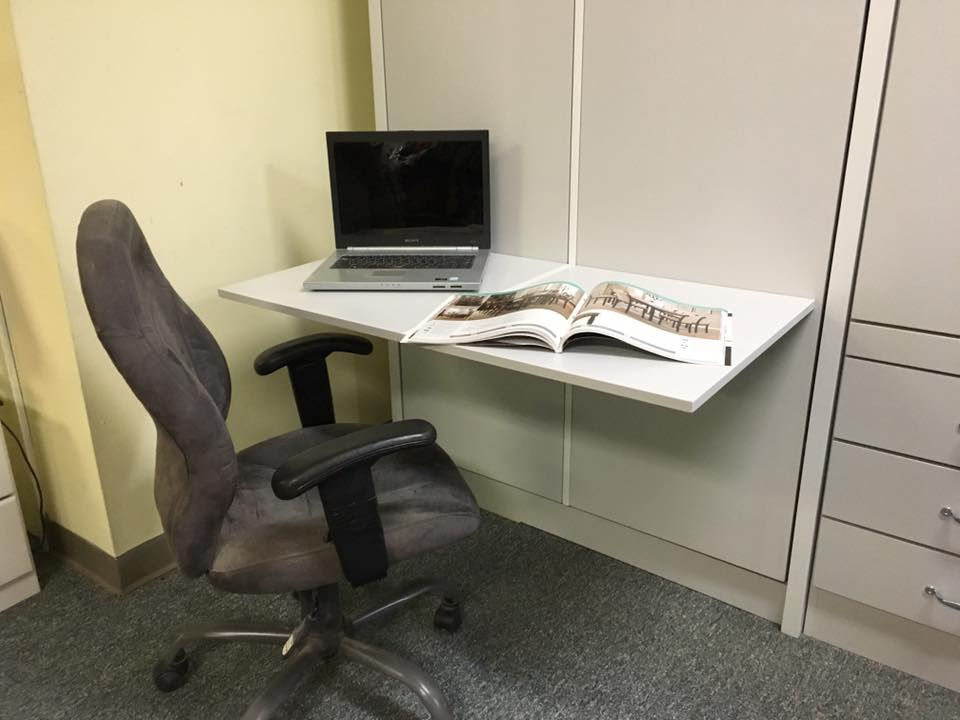 This is our Locker Muprhy bed with a fold down desk.  Benefits of having the desk fold down is you can have more space in the room.  We alos have a stay level desk, where the desk says level as it transistions into the bed.