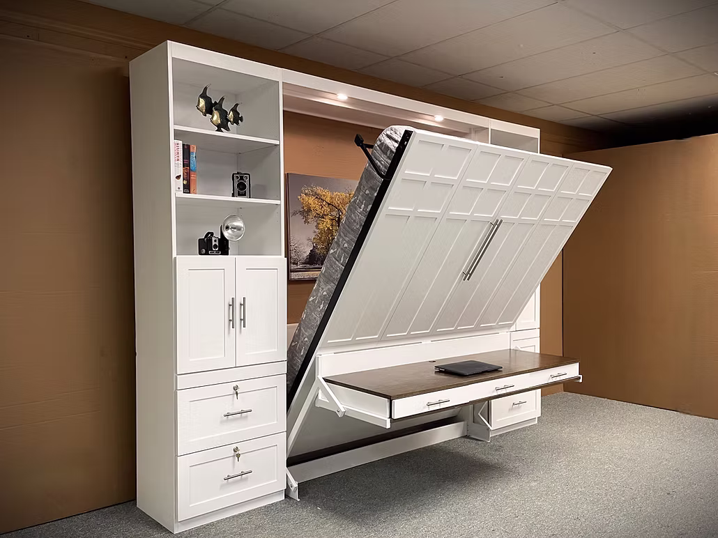 Introducing our extraordinary bed featuring a Frank Lloyd Wright-inspired facade. To create a captivating ambiance, we’ve ingeniously designed the lights to extend beyond the desk section, casting a welcoming glow. These extended lights also prove invaluable when you require extra depth for your bookcases (check out our other pictures for a closer look).