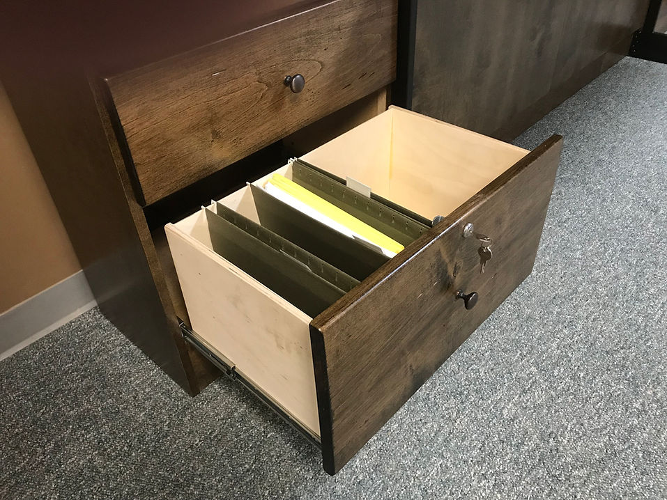 This one has a desk on the front that stays level as it transistions into a bed.  No need to totally clear off the desk section to use the bed. We added 24″ bookcaes with adjustable shelves on the top and 2 drawers and drink tray on the bottom.  The lower drawer was upgraded to a file drawer with a lock.