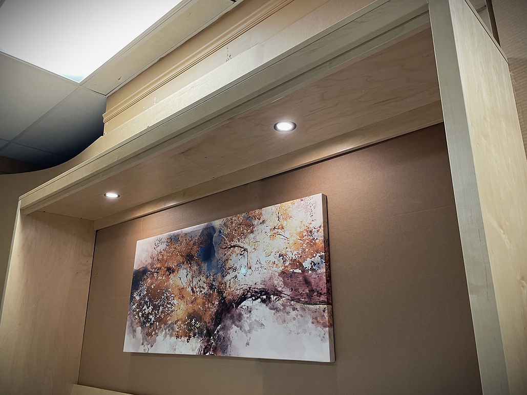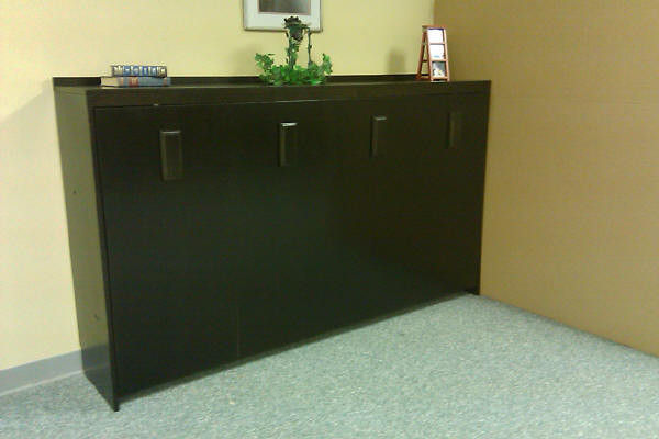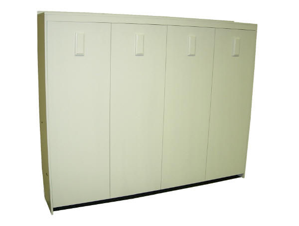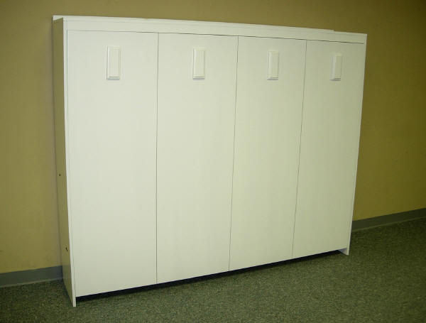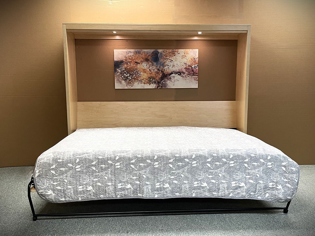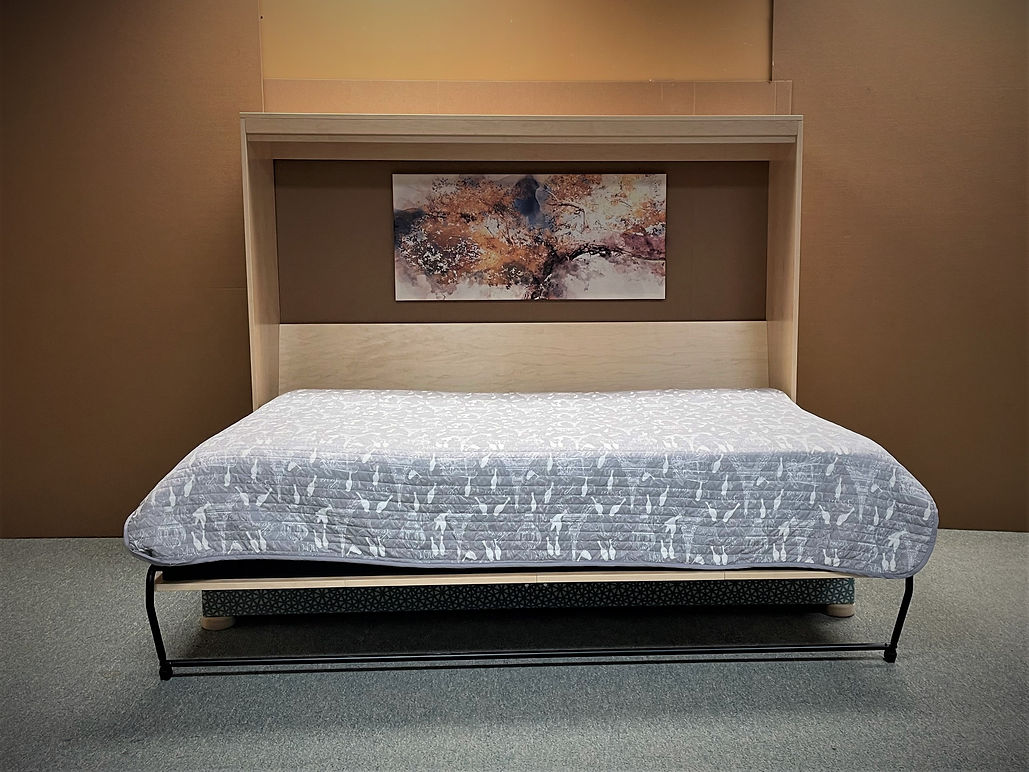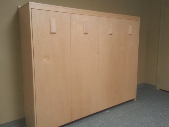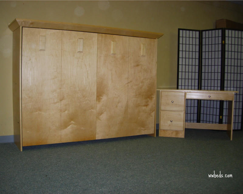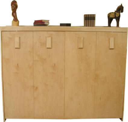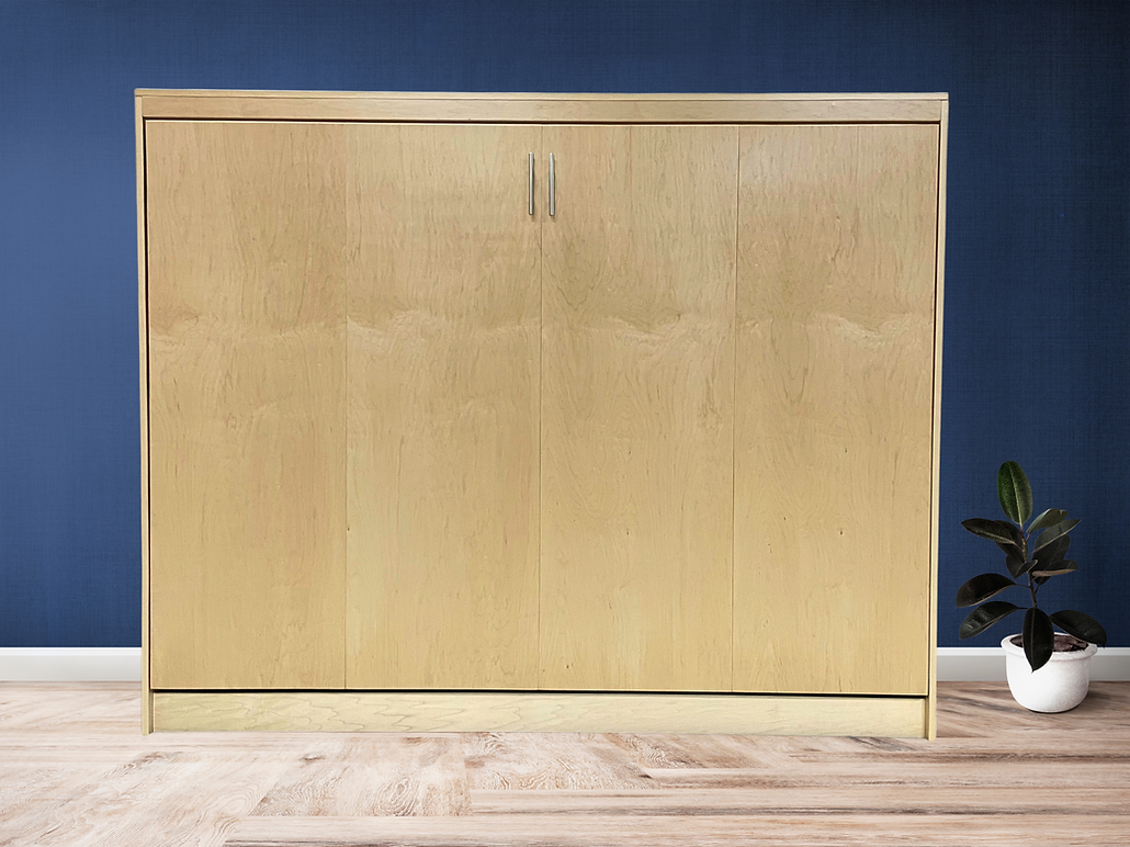 This is our simplest version or our Murphy wall bed. This contemporary piece is designed to resemble a bi-fold closet. This is accomplished by cutting grooves into the face panel. This makes it look like a perfect 1/8″ gap between the doors. We can custom build this with any wood and finish.