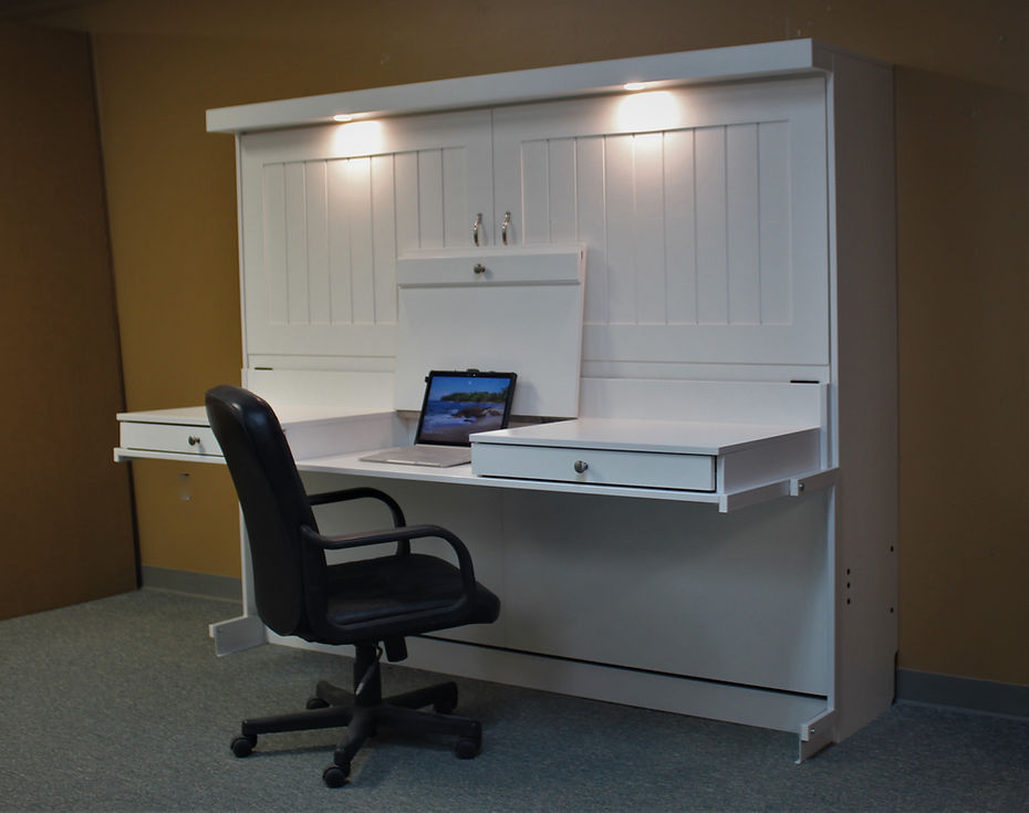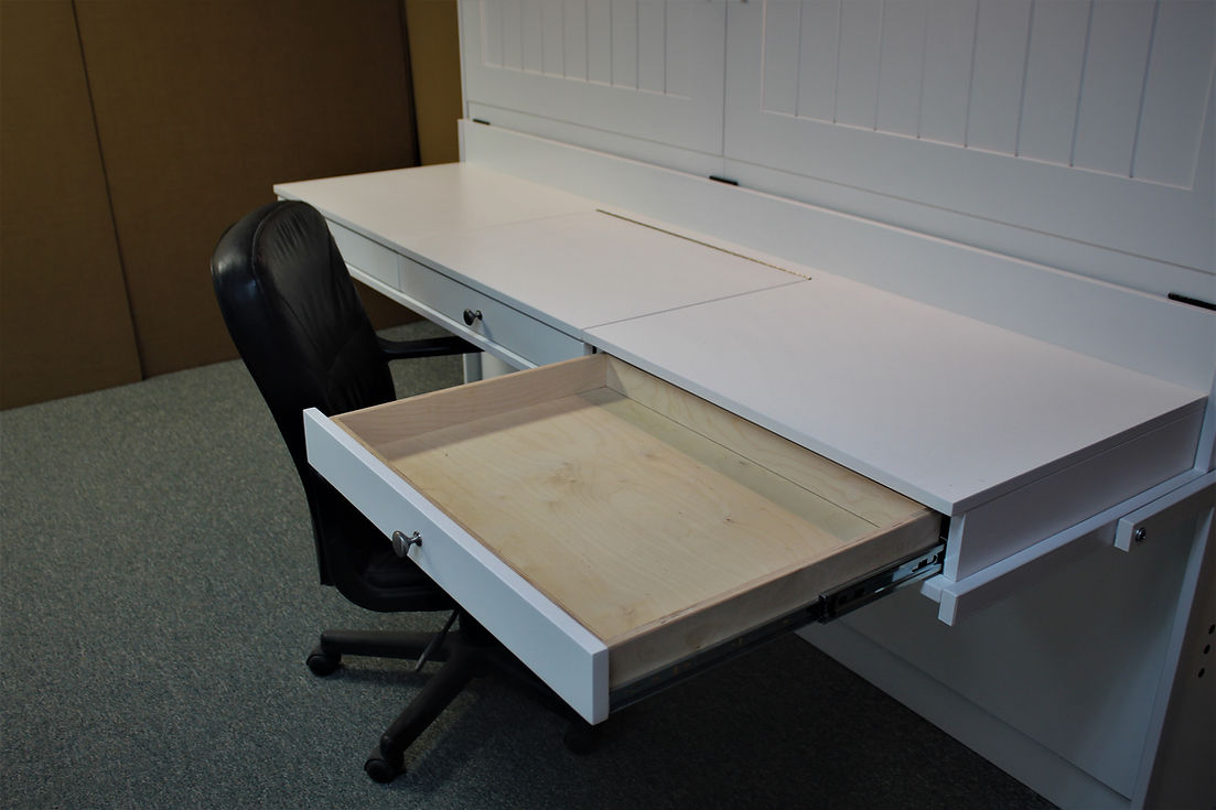 The vanity is a modification of our “Stay Level” desk. It has 2 drawer and a lift up work area with mirror. The vanity stays level while it transforms into a bed.