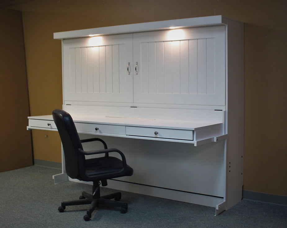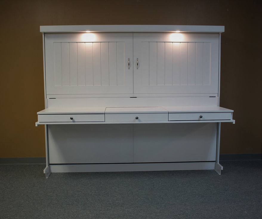 This is a Murphy bed with a barn door look to the face. It is a Horizontal (sideways) version shown in a full size, but queen size is also available.