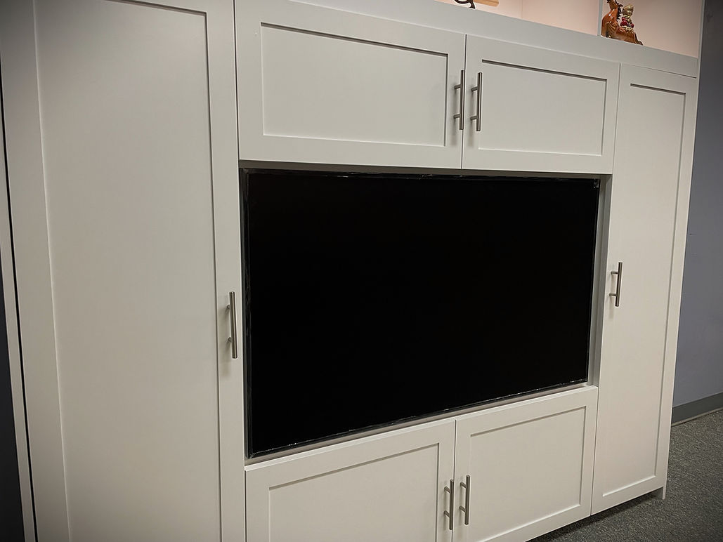 This one has the 55″ Samsung The Frame” LS003 Series. This is the most popular version used on these beds. This Television is made to fit tight against the wall and works well with this Murphy bed. The power cord is low profile and the accessories hook-up such as HDMI or Cable will be controlled by a box that can be placed anywhere. That box is connected by a very thin wire. Up to a 65″ will fit in this style murphy bed. We can even add a sound bar.