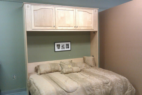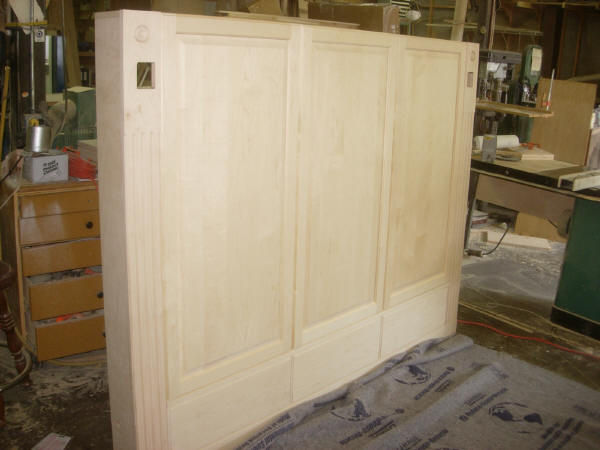 This horizontal (sideways) murphy wall bed has a raised panel face that arches at the top. We divided the face into thirds and put a door and drawer front in each section.