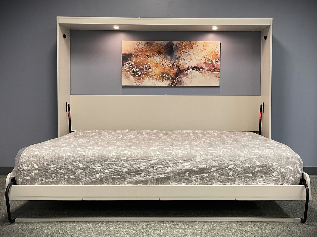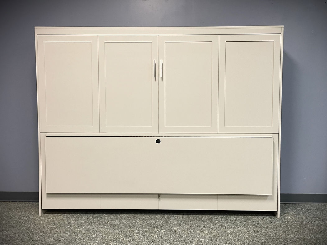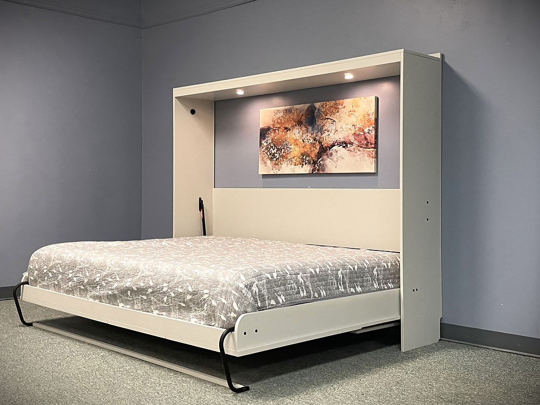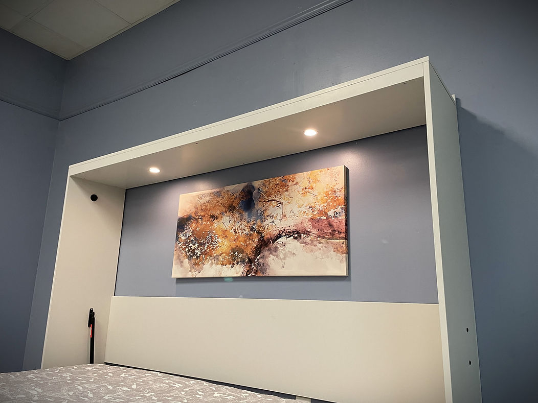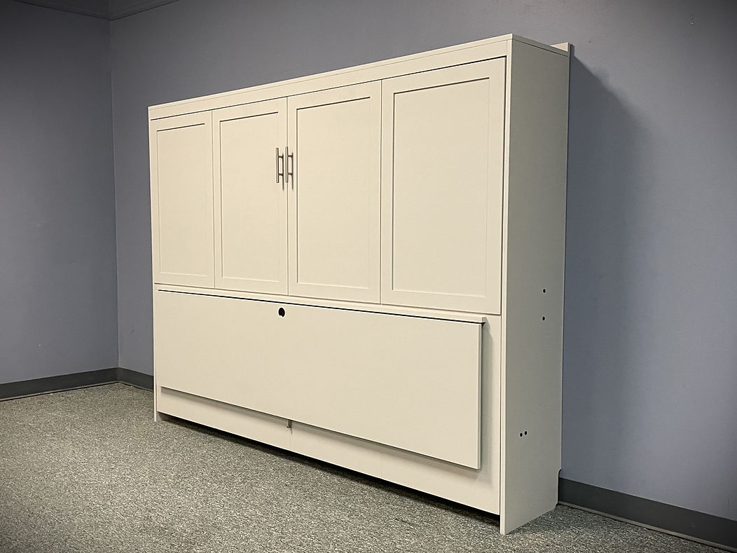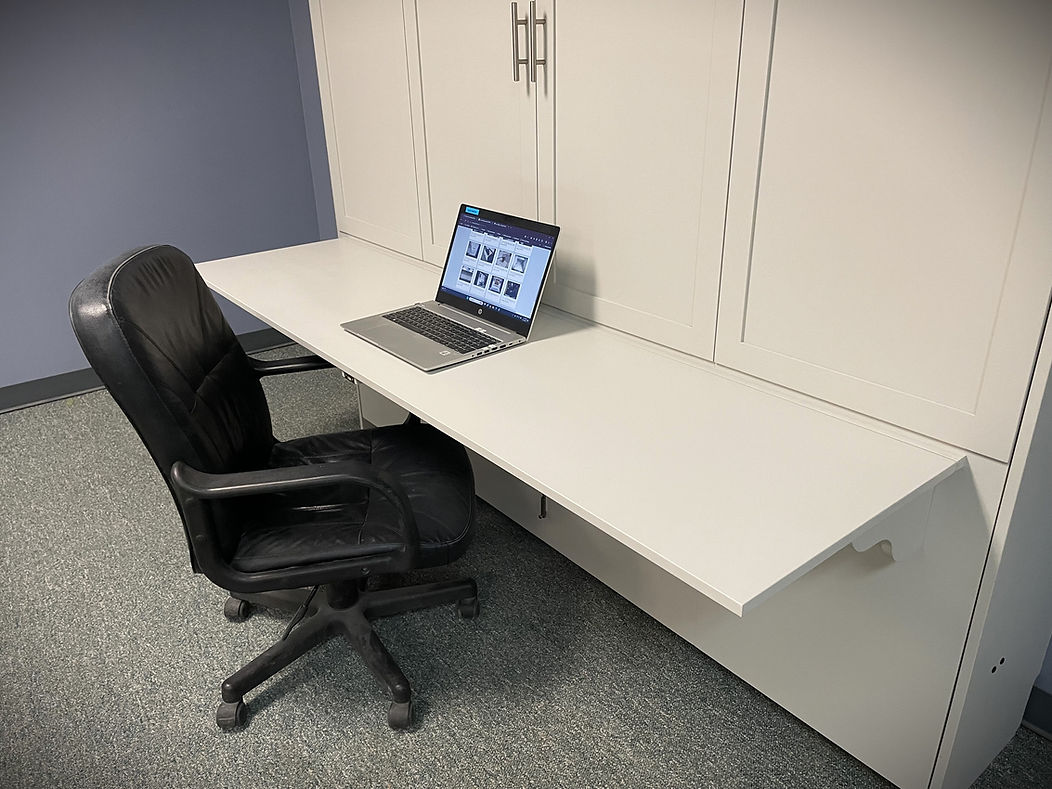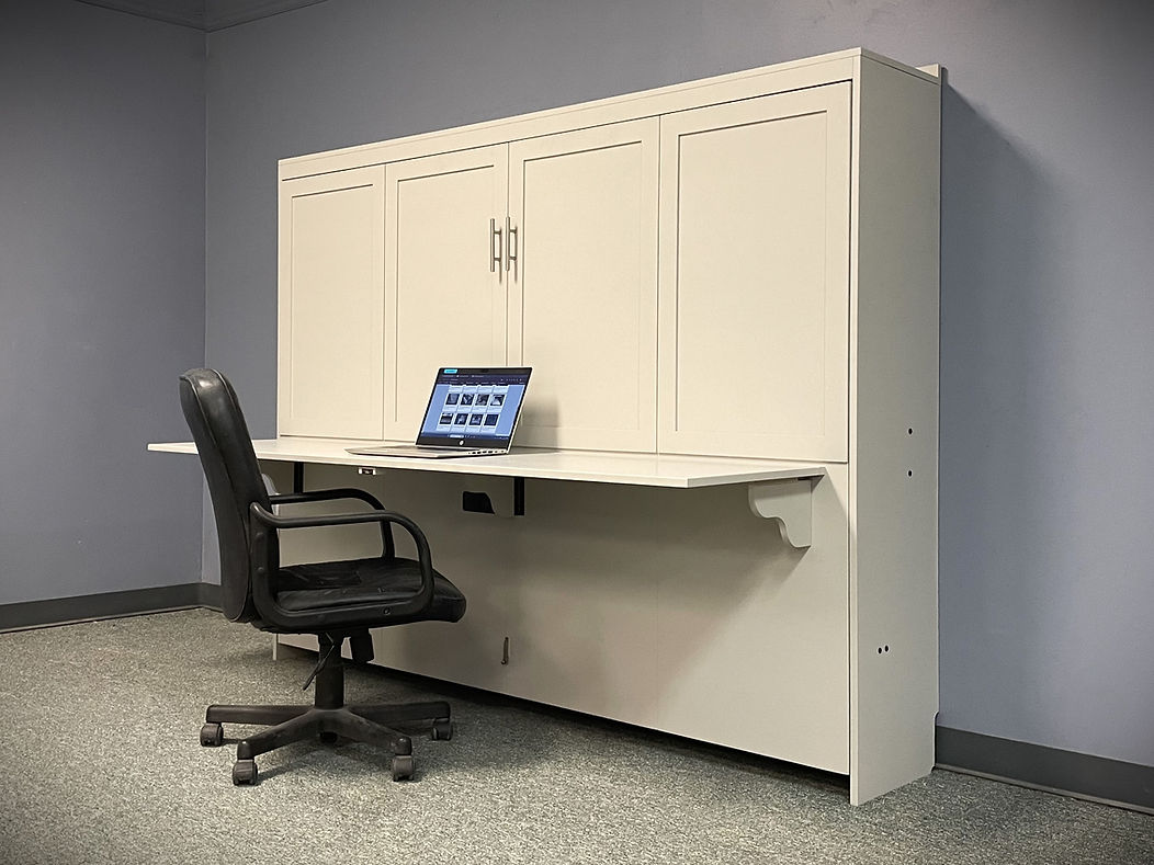 This horizontal (sideways) Murphy Wall Bed that has a desk that can fold down. This is perfect for smaller rooms that you are wanting to make dual-purpose.