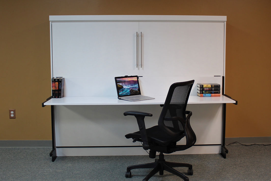 This is a desk that does not need to be cleared off when transitioning into a bed. It stays level when you pull the bed open.