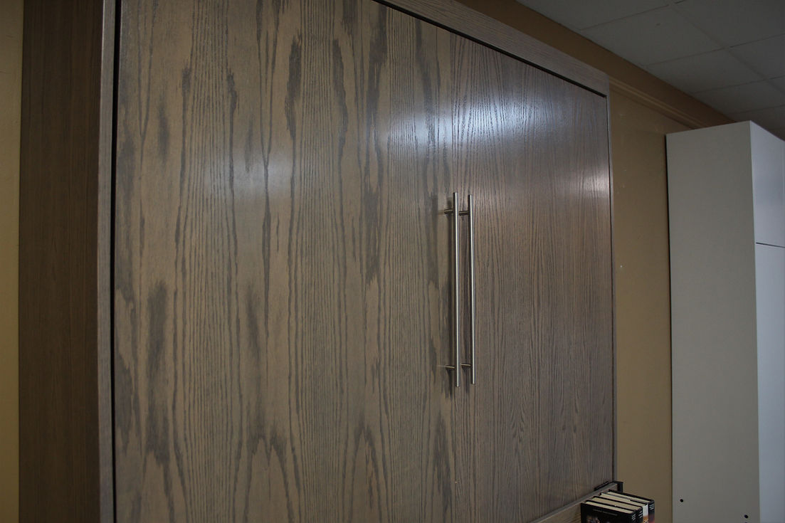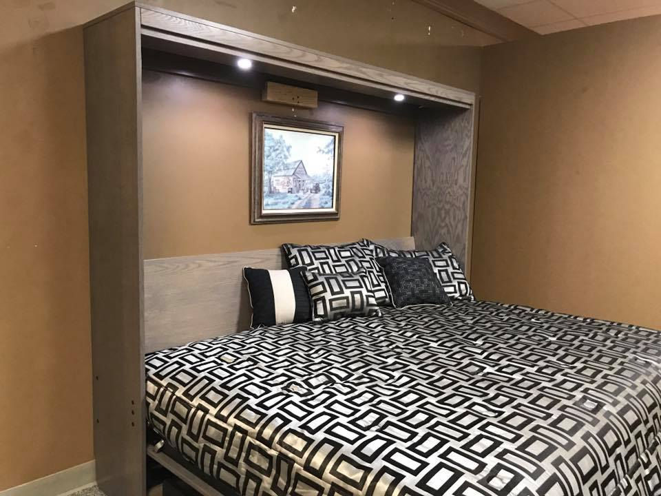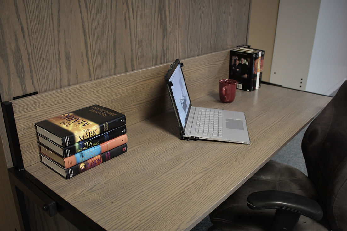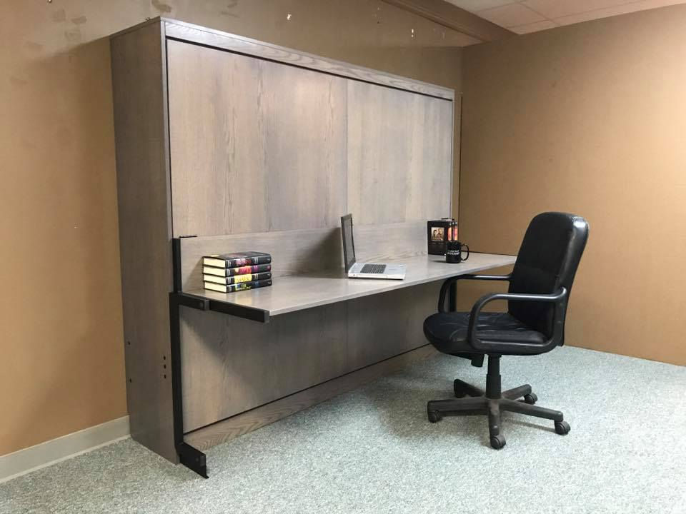 This is a desk that does not need to be cleared off when transitioning into a bed. It stays level when you pull the bed open.