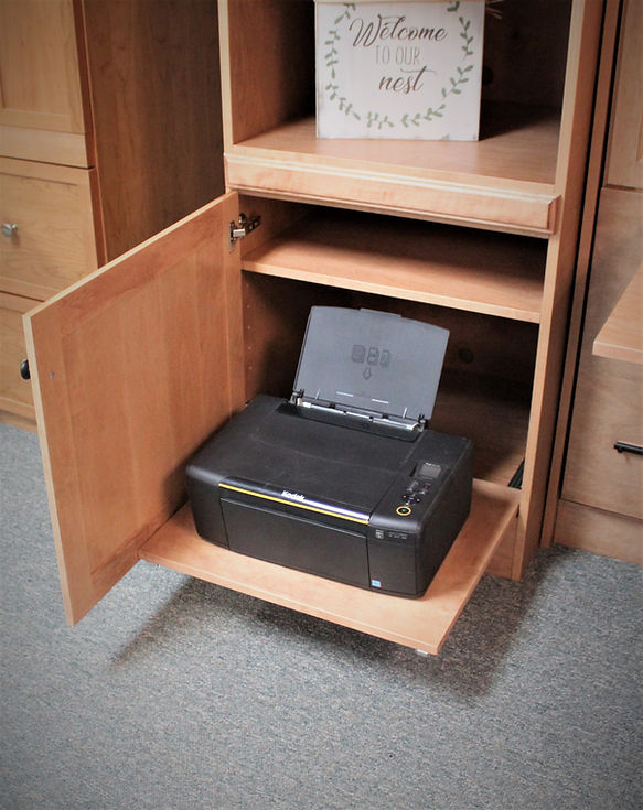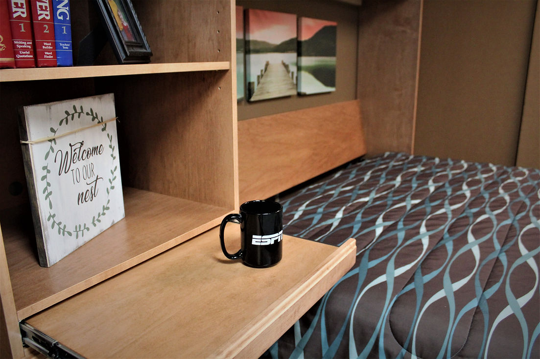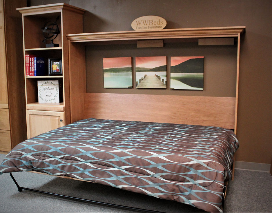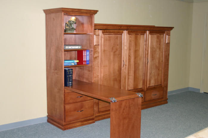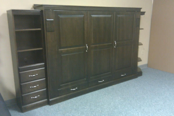 This horizontal (sideways) murphy wall bed has a raised panel face. We divided the face into thirds and put a door and drawer front in each section.