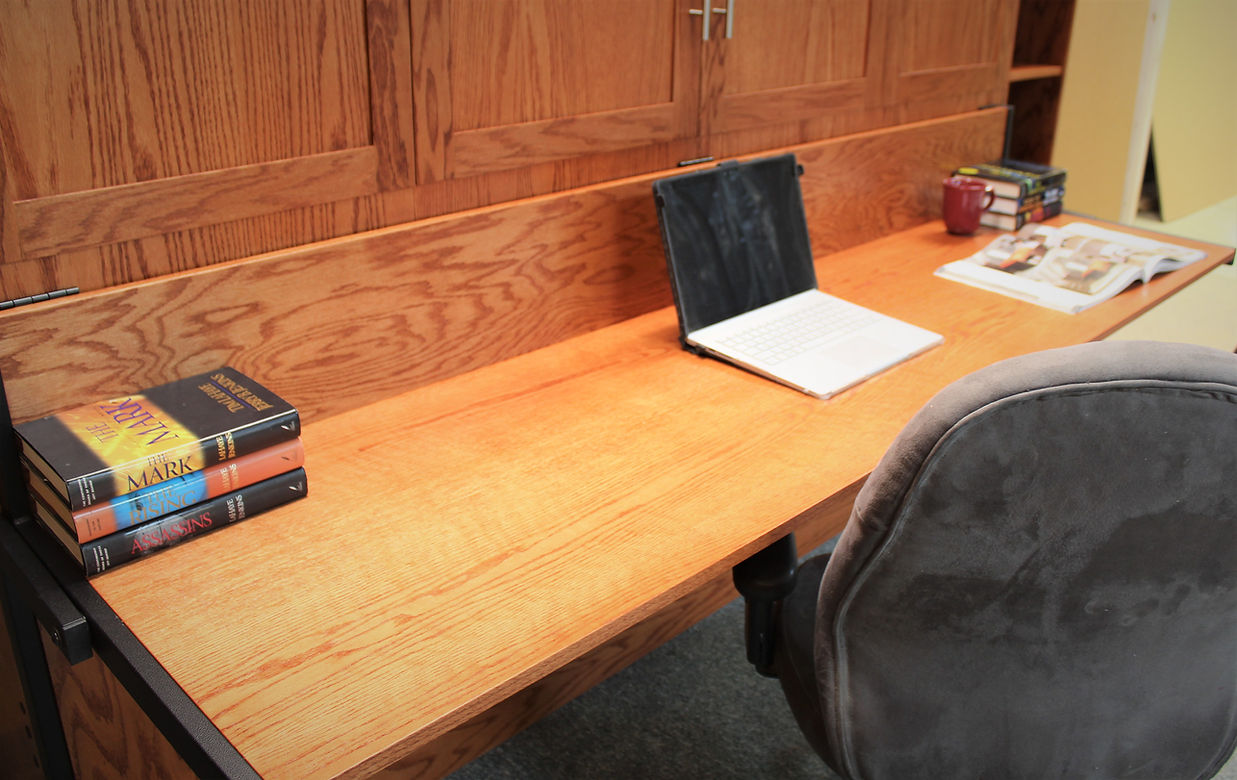 The desk added to this on is our Stay-Level desk. No need to clear off the desk when using the bed. It stays level as it transitions. You’ll see at least two versions of that desk. Our standard Stay-Level desk and a version with drawers added.