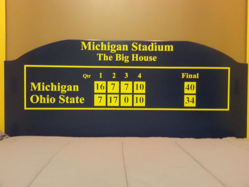 The is a murphy wall bed designed with a locker theme. This one has the University of Michigan theme but any team is available. The three center doors are false and come down with the bed. The outer bookcases are actual working bookcases.