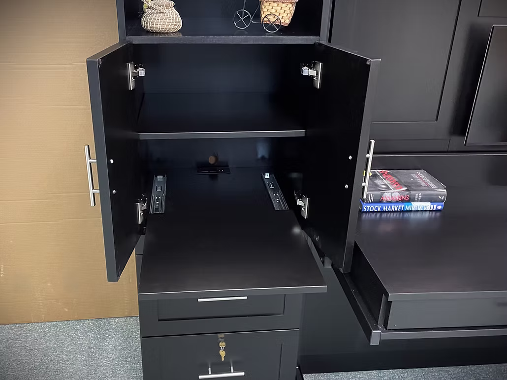 When closed, the bed resembles a sleek and modern home office, seamlessly blending into your décor while offering a convenient spot for your office and media needs. When opened, it reveals a high-quality, comfortable bed—ideal for hosting guests or creating a multi-purpose room.
