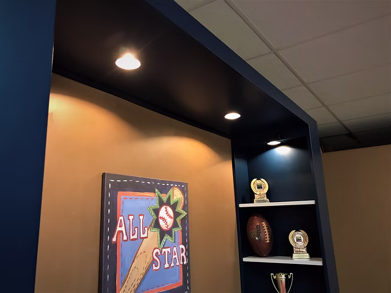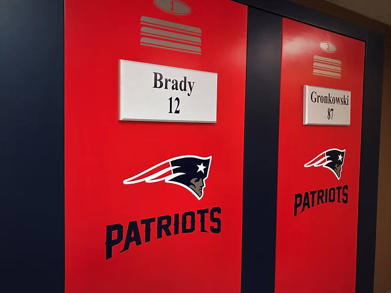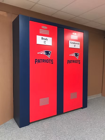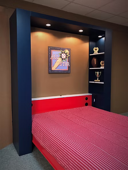 he is a murphy wall bed designed with a locker theme. This one is in the New England Patriots theme, but others team are available. The locker doors come down to form the bed. Bookcases can be added in any width. This one as an Inset bookcase. We took that same width of the inset bookcase and added a divider between the doors.