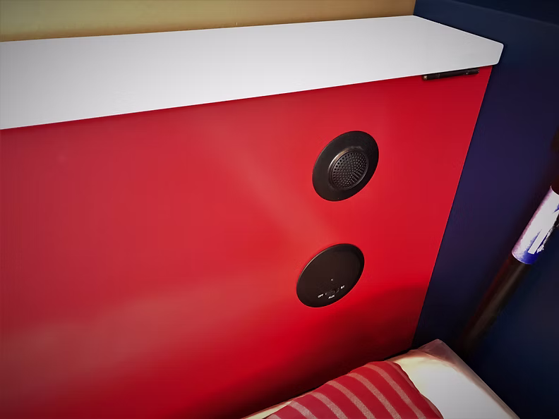 *Inset bookcases are tuned inward and is 6″ wide. They are seen only with the bed is open. Free charging station on each side.