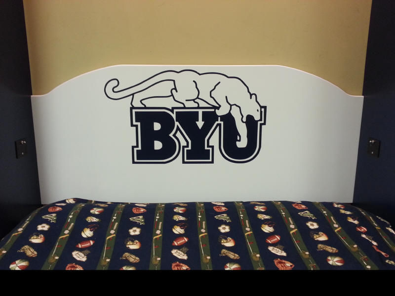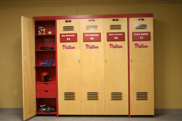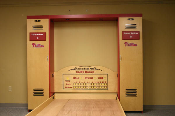 The is a murphy wall bed desinged with a locker theme. This one has the Philadelphia Phillies theme but any team is avaliable. The three center doors are false and come down with the bed. The outer bookcases are actual working bookcases.