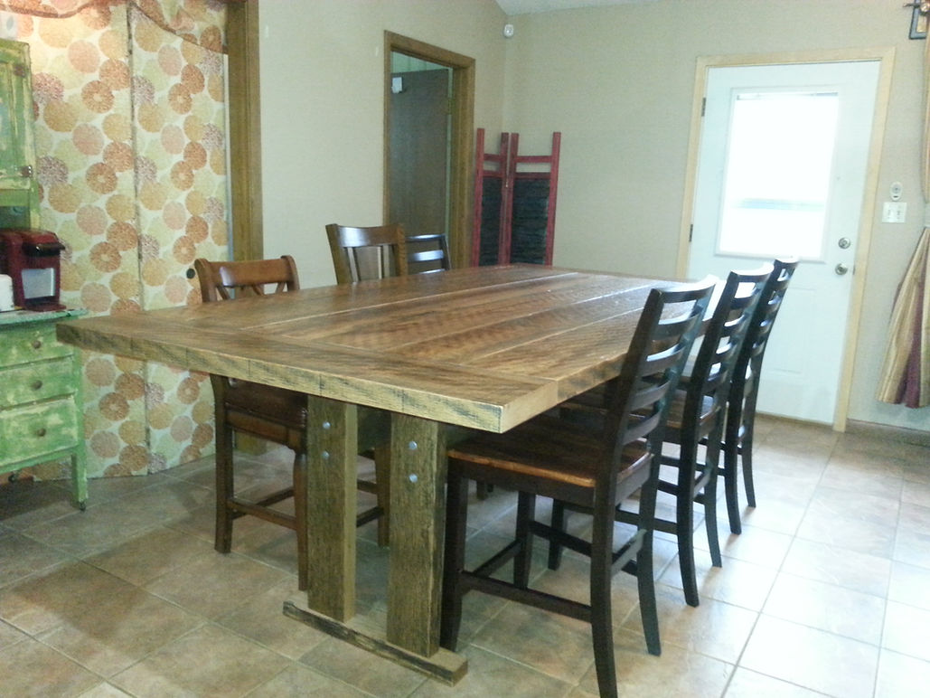 This is a custom table built in December 2015. It is 54″w x 96″l x 36″h. With it being 36″ high, it was designed to be used with bar height chairs. We can build this one to whatever height you want.