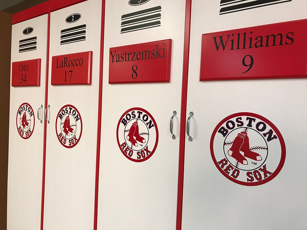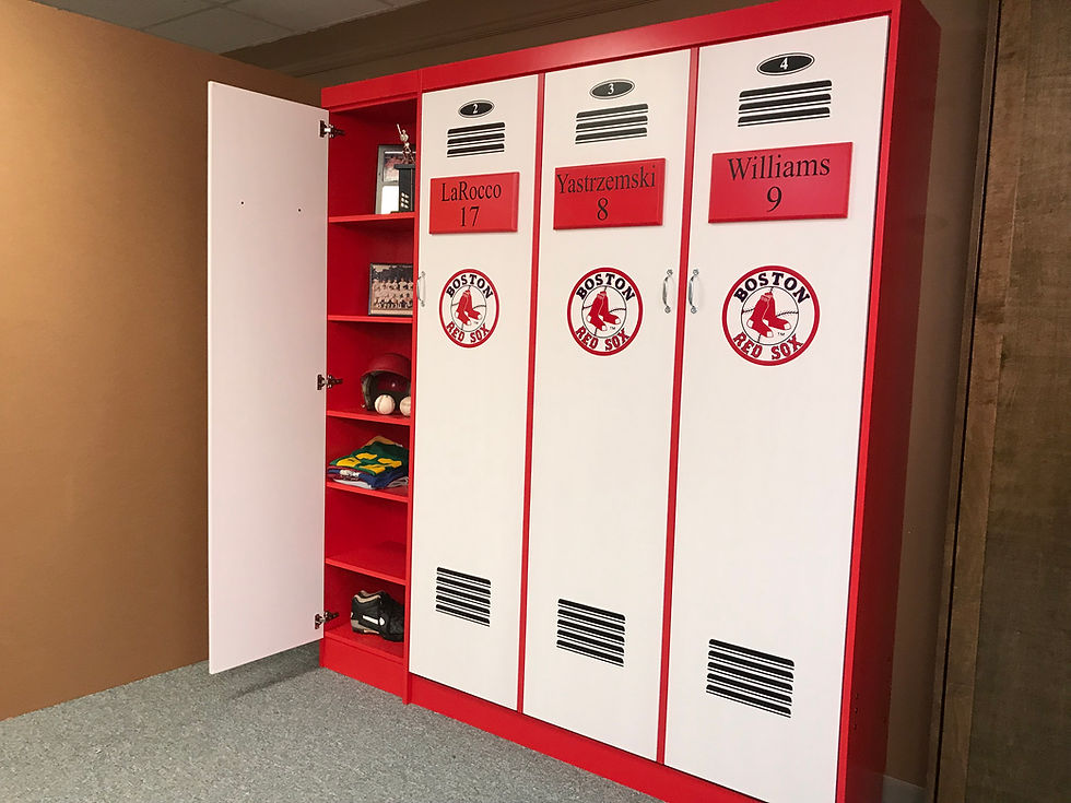 The is a murphy wall bed designed with a locker theme.  This one is in a Red Sox Baseball theme, but others team are available.  The locker doors come down to form the bed.  Bookcases can be added in any amount. This example is shown with only one bookcase