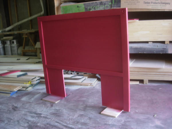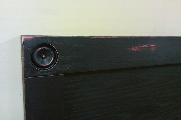 This is a bed that was designed by a customer. They told us they wanted drawers, a panel headboard with rosettes on the corners in black. One of our furniture designers suggested using the oak wood for texture and using a red undercoated instead of black for the base. This allow the finish to rub through and expose the red for a distressed look.