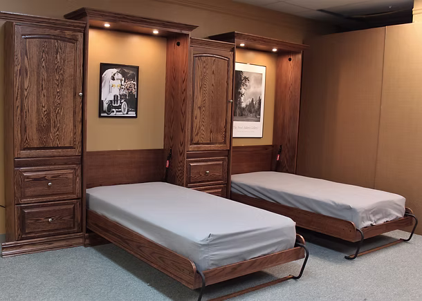 Here is a break-down of the Smith #1313-2020 Two twin version with two bookcases (in Red Oak Finish) Size w/crown 82 7/8"h x 137 3/4"w x 18 1/4"d Projection 80"