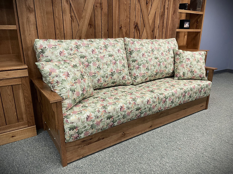 This murphy bed is designed to look like a pair of Barn Doors. You’ll see many configurations. Most will have grooves cut into the face to resemble planks of boards, keeping a wider panel creates a stronger face. We then trim each door using 4″ wide molding with a diagonal down the center.