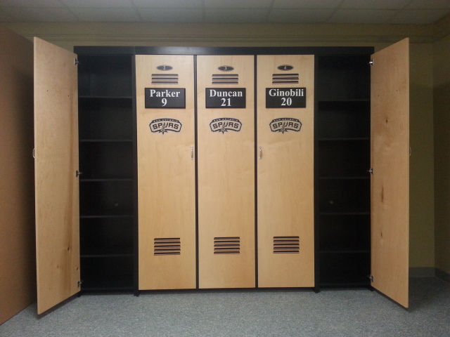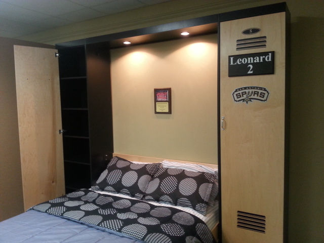 The is a murphy wall bed designed with a locker theme. This one has the San Antonio Spurs theme but any team is available. The three center doors are false and come down with the bed. The outer bookcases are actual working bookcases.