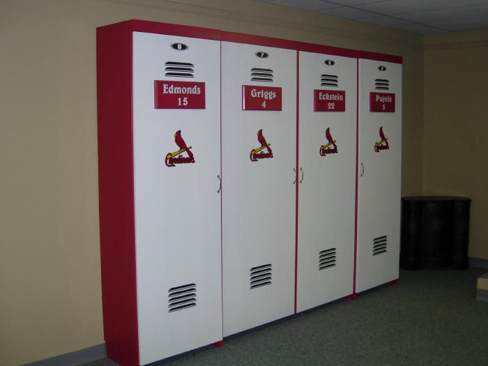 The is a murphy wall bed desinged with a locker theme. This one has the St. Louis theme but any team is avaliable. The two center doors are false and come down with the bed. The outer bookcases are actual working bookcases.