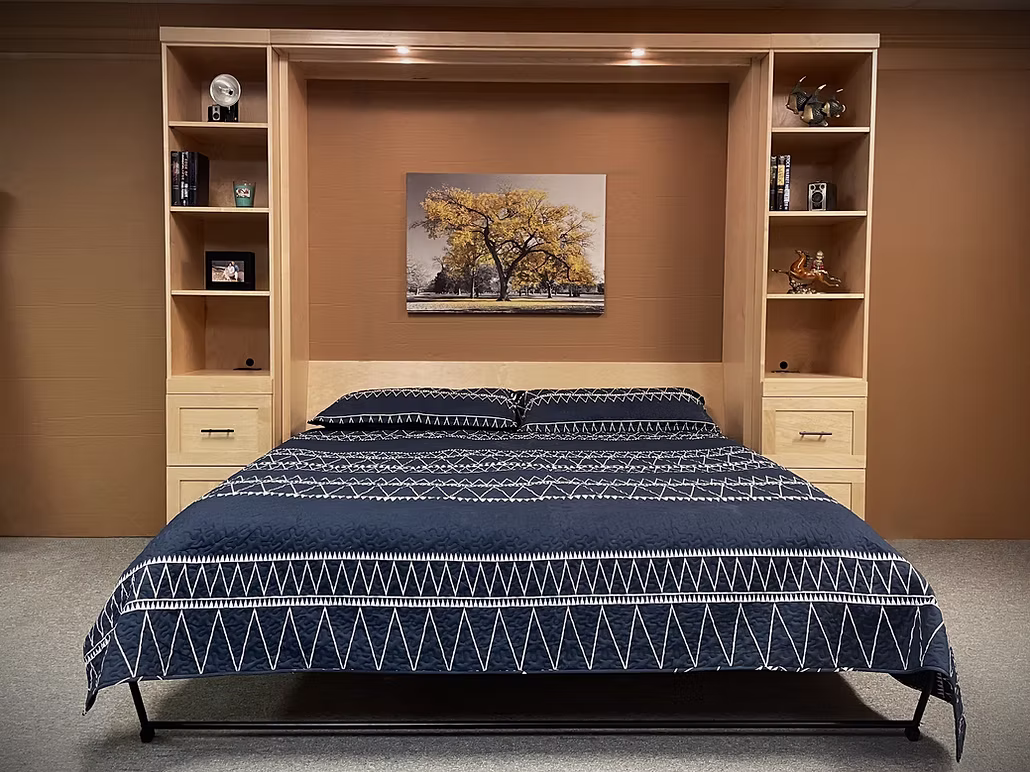 The Templeton Murphy bed with desk is a shaker style face that is divided into four doors with 2 1/4″ trim. It gives the appearance of four doors above the desk.