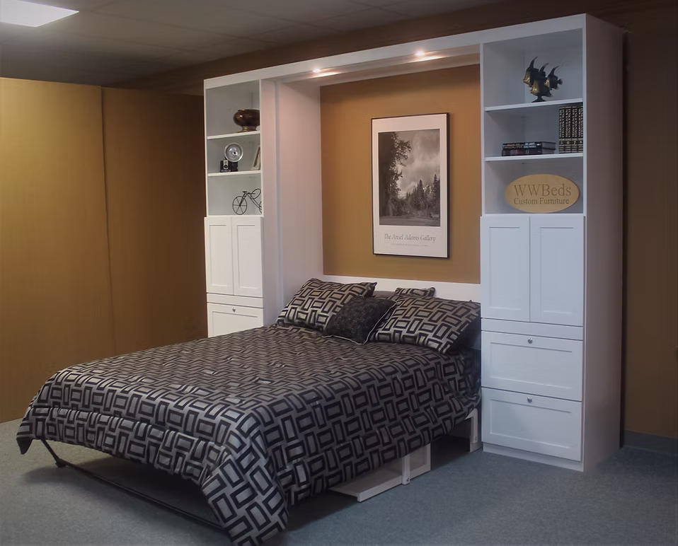 The Templeton Murphy bed with desk is a shaker style face that is divided into four doors with 2 1/4″ trim. It gives the appearance of four doors above the desk.