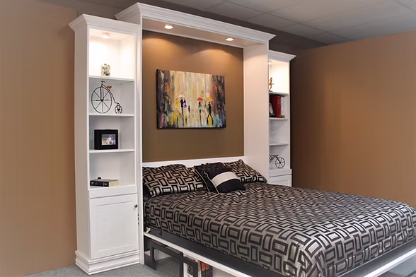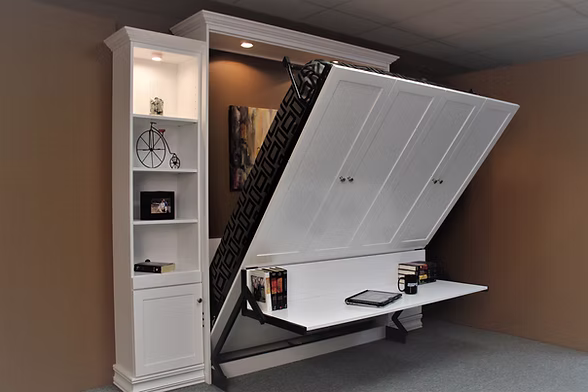 The Templeton Murphy bed with desk is a shaker style face that is divided into four doors with 2 1/4″ trim. It gives the appearance of four doors above the desk.