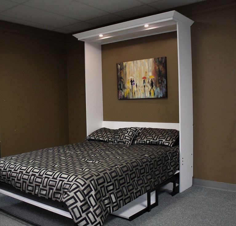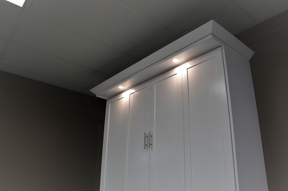 The Templeton Murphy bed with desk is a shaker style face that is divided into four doors with 2 1/4″ trim. It gives the appearance of four doors above the desk.